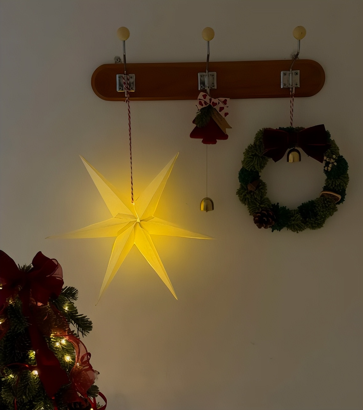 再把六个角全都粘贴起来,用灯串缠绕在一起,用两根麻绳分别用美纹纸或者胶带贴在星星里面。