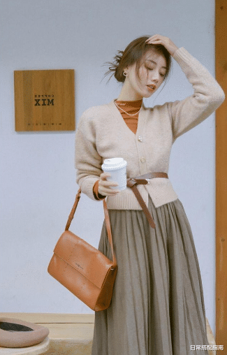 如果本身身形有些微胖,那么在穿奶奶衫的时候,可以借鉴英式的复古感,比如在腰间扎一个修身的细款皮带,能够打造出纤细的腰身,同时里面叠穿一个堆堆领的衬衫,既能保暖,也让上身更有层次感,下搭一个百褶裙,展开的廓形,也让她对于身形有着不错的修饰感。