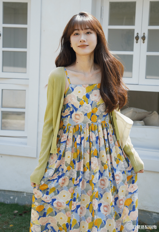 天气渐热,那么我们的奶奶衫就可以搭配长裙了。如何让短款奶奶搭配长裙显得更好看,我们可以选择相邻色的搭配方式。比如灰蓝色奶奶衫搭配深蓝色碎花裙,因为颜色从浅到深,这种相邻色的渐变感,也会让整体穿搭显得更有一致性。
