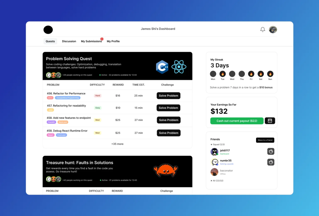 例如,用户@James Shi 上线三天,完成四个任务,任务类型包括性能重构、调试、多语言转换等,已经领取132美元奖励。