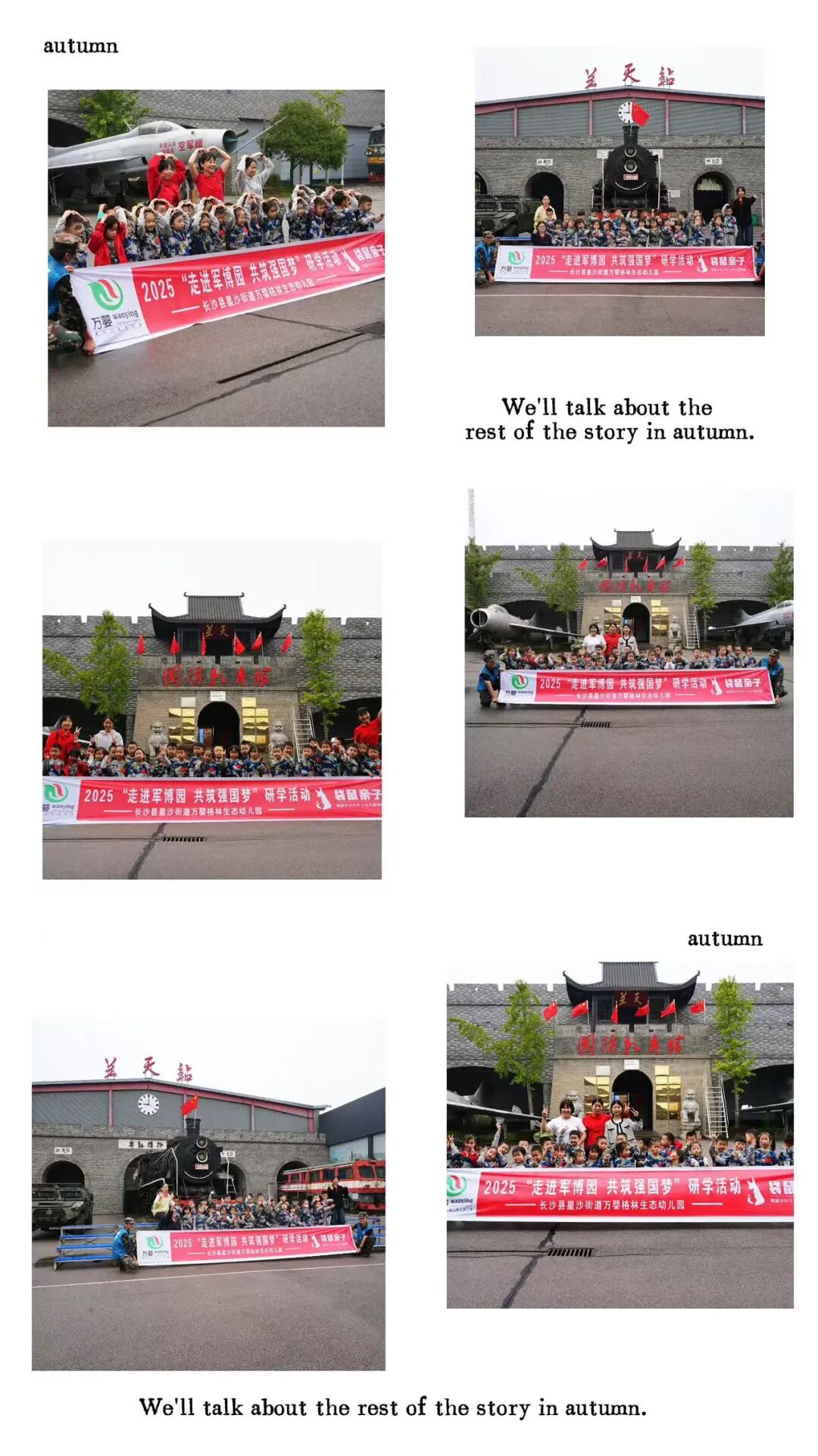 抵达兰天军事博览园,小萌娃们迅速整好队伍,像小军人一样挺拔站立。当五星红旗随着军人叔叔一同前进时,孩子们挺直小身板,庄严地行注目礼。这一刻,爱国的种子在心底悄然萌发。让我们用一张整齐的合影,记录下对祖国的敬意,为国庆送上最真挚的祝福!