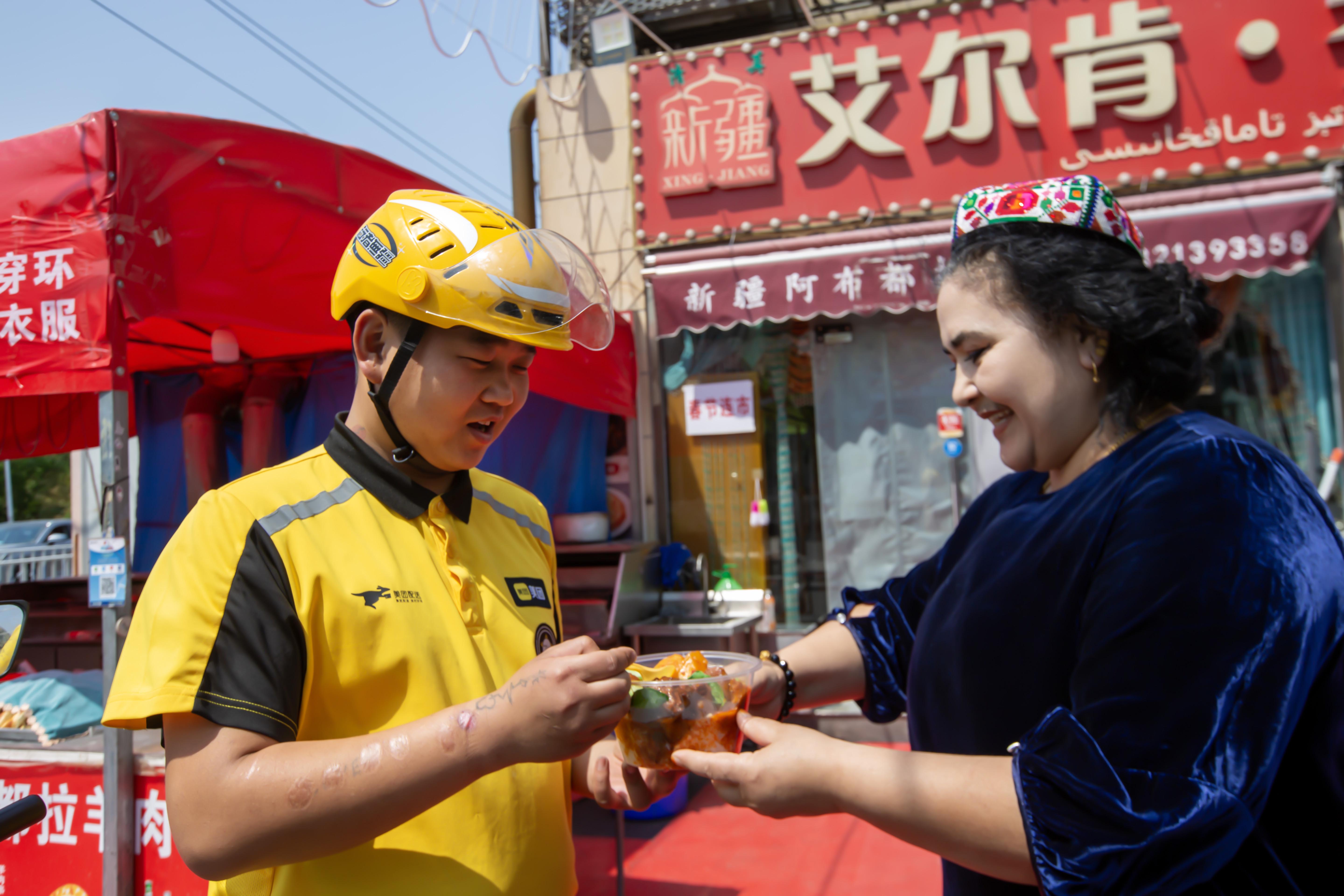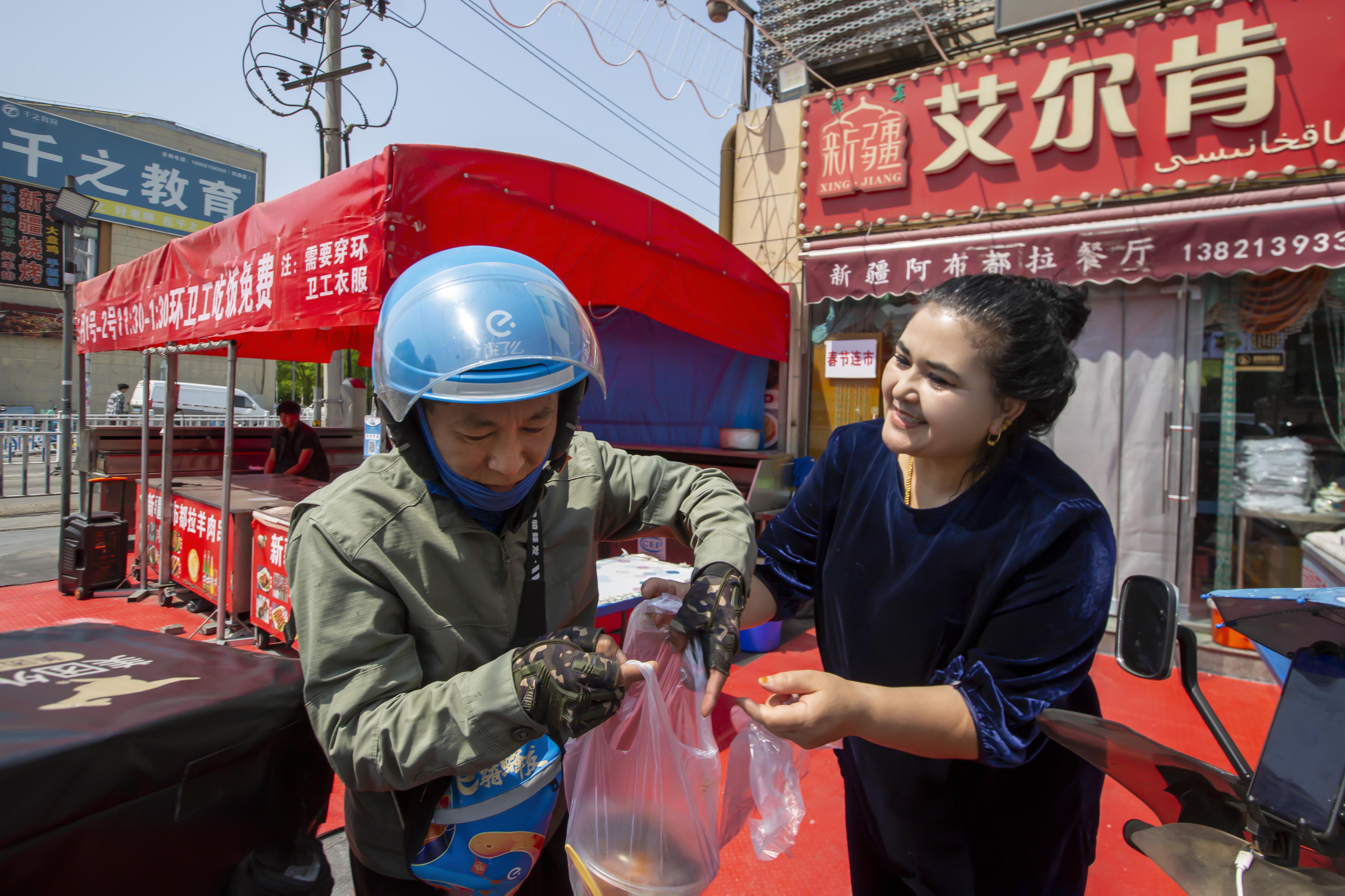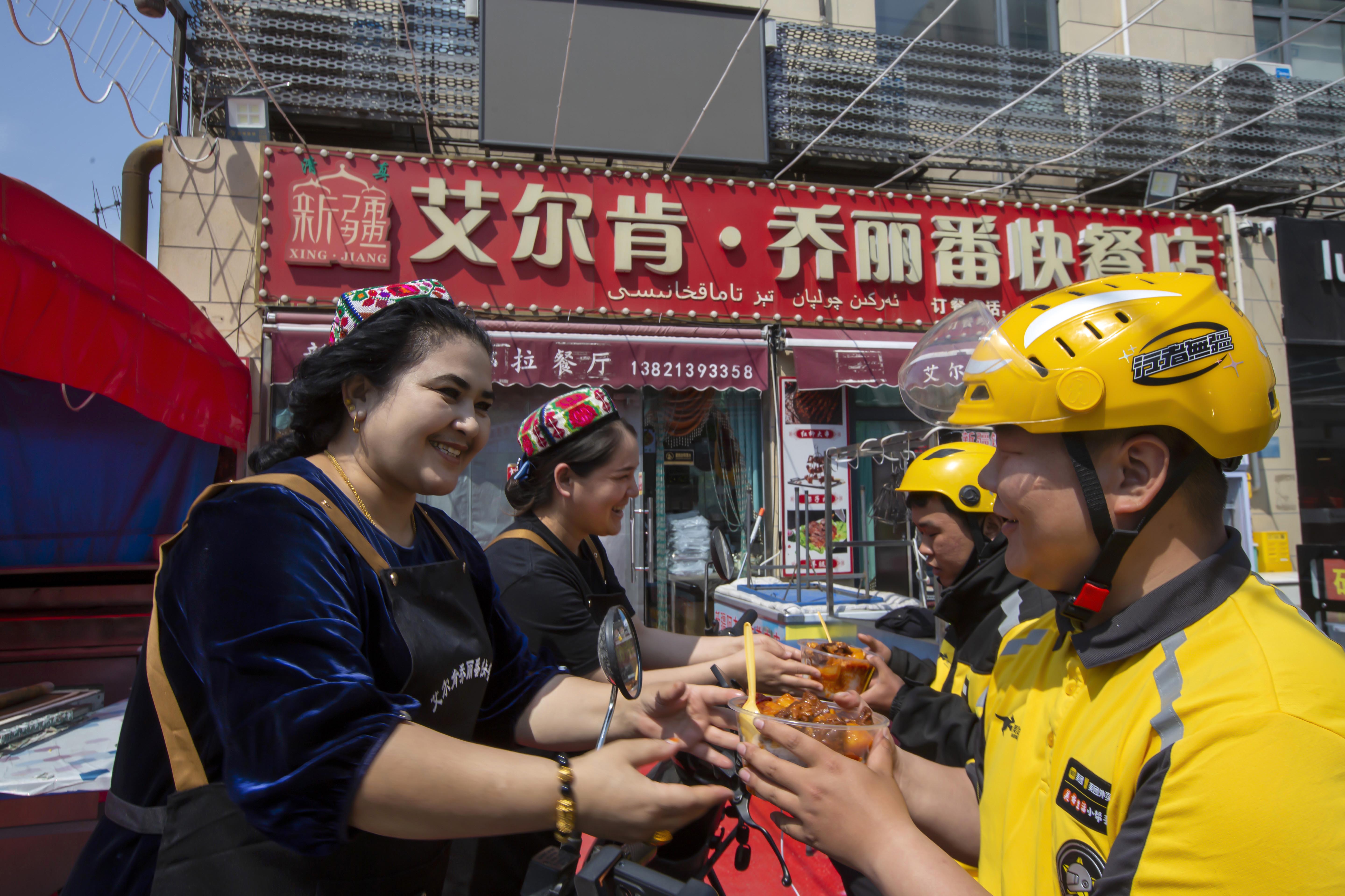 2025年5月2日,天津市西青区精武镇富家湾,“维族大姐”乔丽帕娜依•热合木(左)与店员阿得拉木•哈得尔江正在把香喷喷、热乎乎的红烧牛肉米饭送给这两个外卖小哥,让辛勤的外卖员分享新疆美味,感受户外劳动者的光荣和自豪。(河南毕兴世  新疆解金刚)