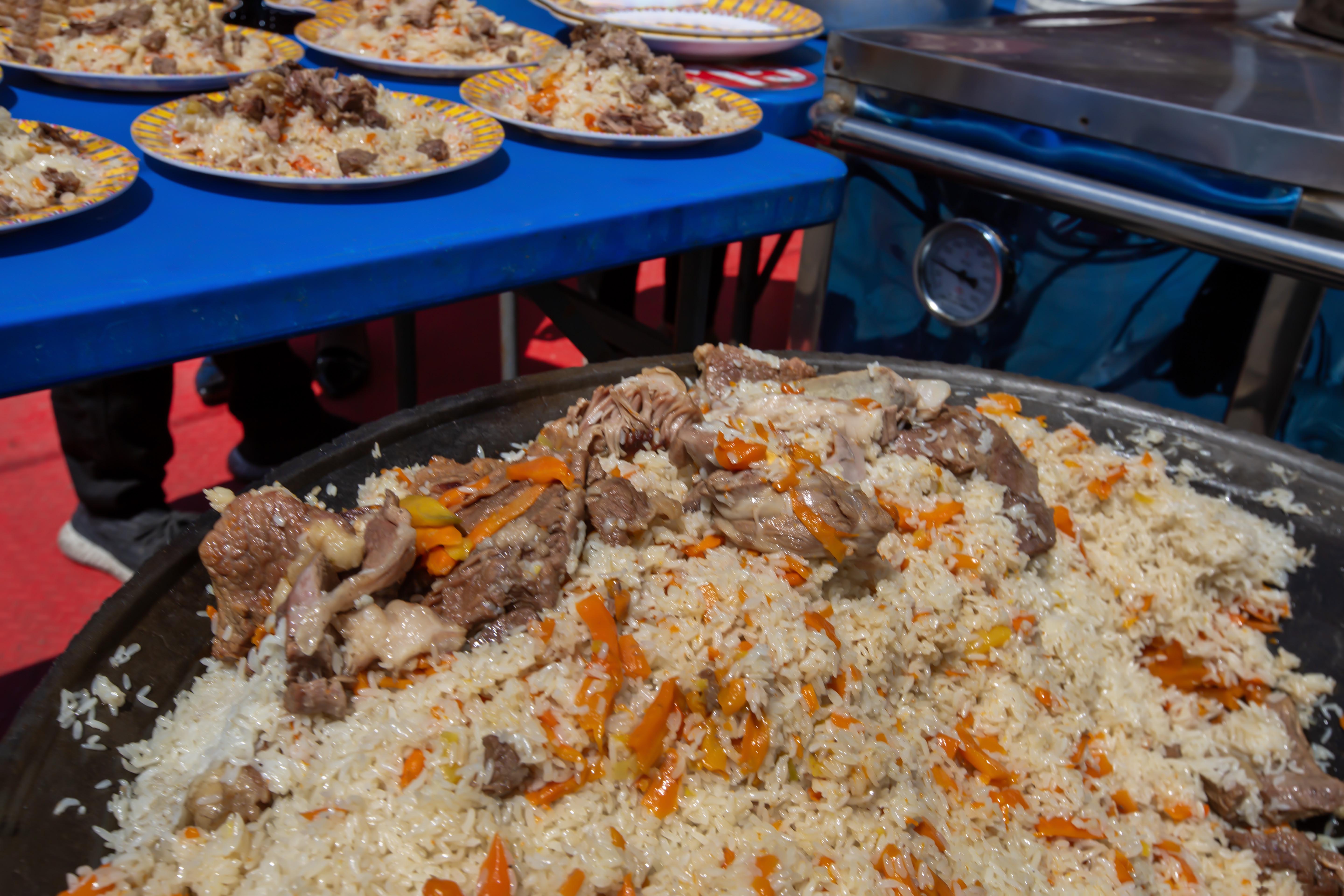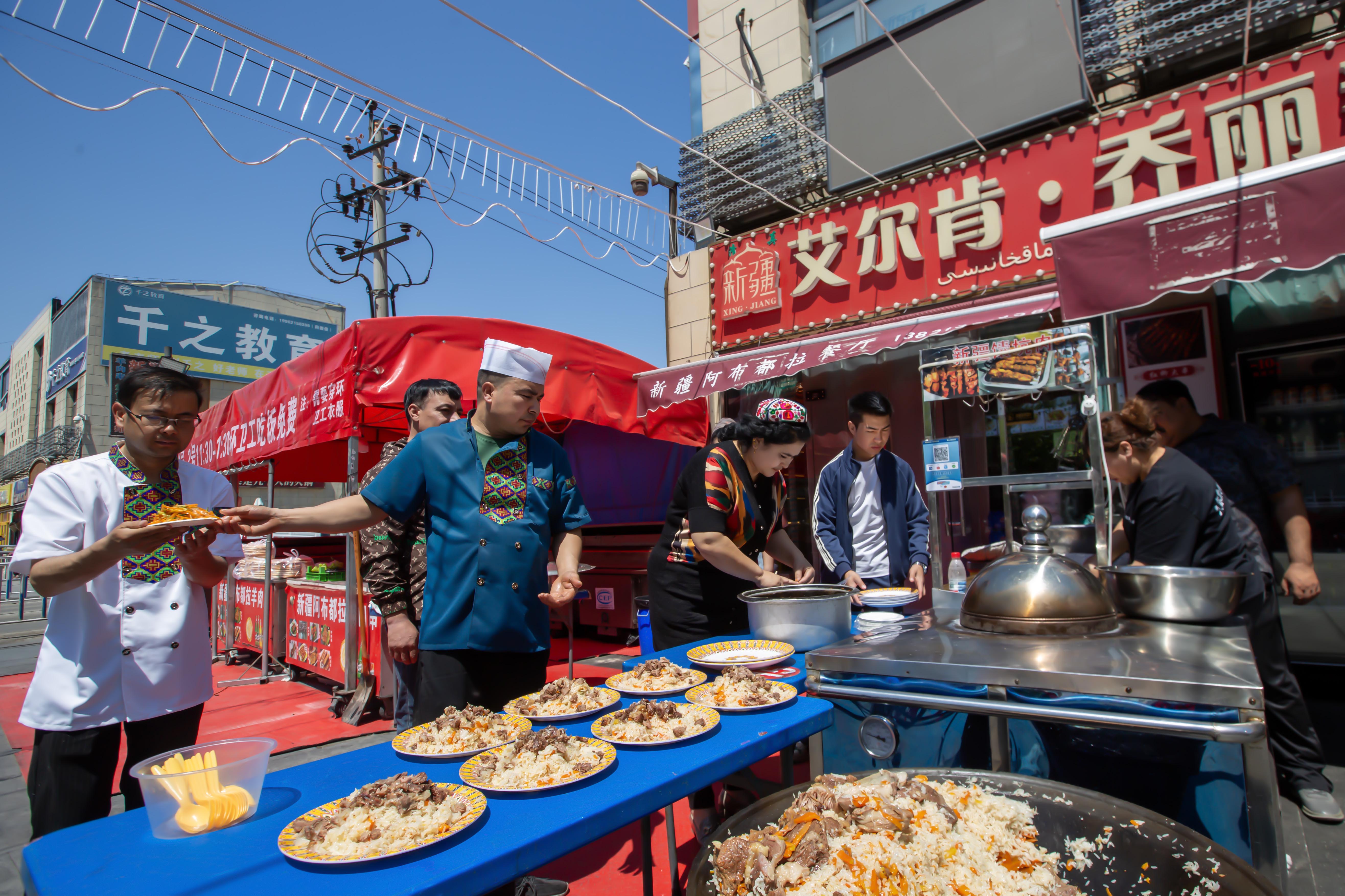 图为“维族阿姨”端着抓饭走向环卫工专席。“抓饭”在维吾尔语叫“波罗”,是维吾尔、乌兹别克等民族招待宾客的风味食品之一。在逢年过节、婚丧嫁娶等日子里,都必备“抓饭”招待客人。