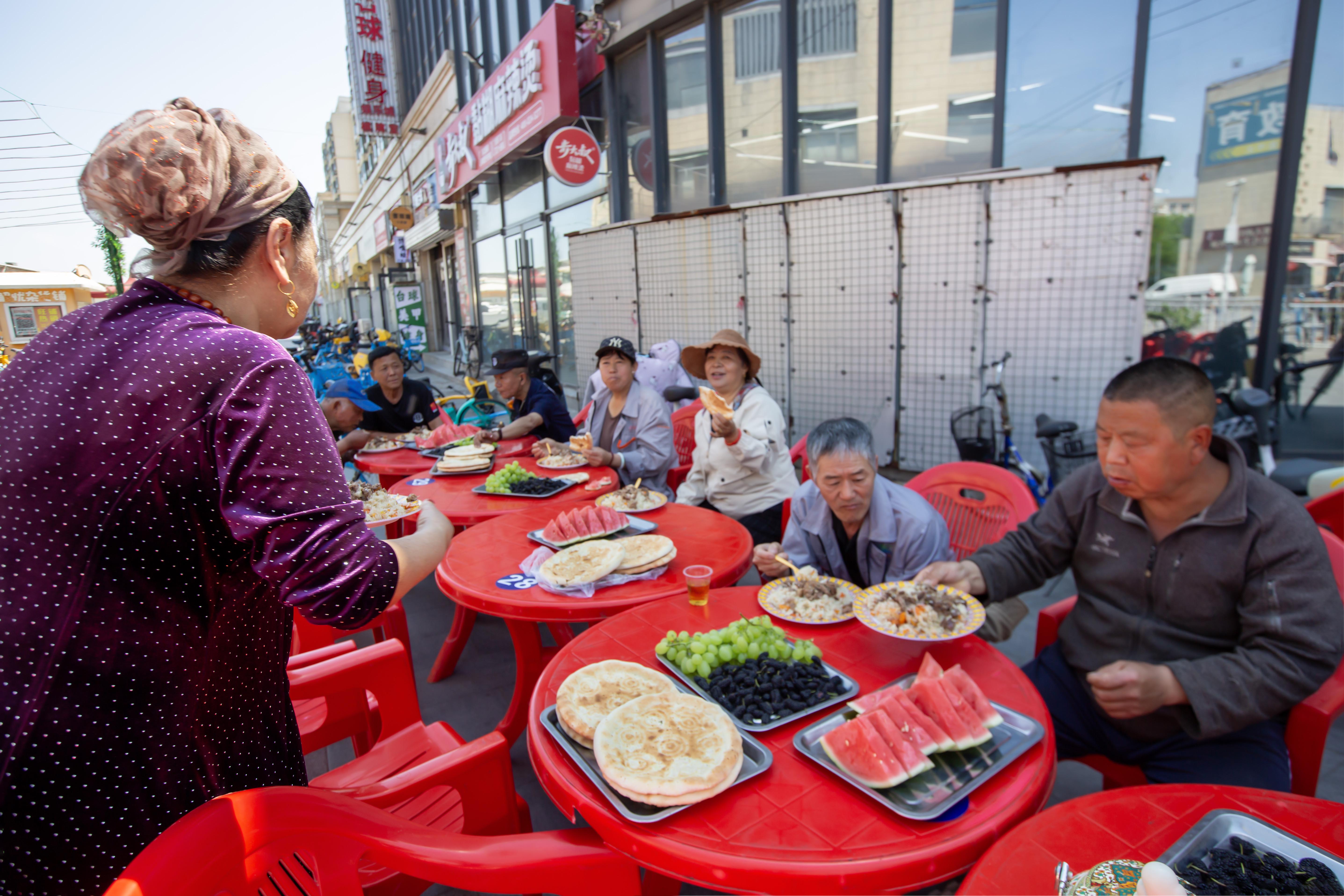 2025年5月1日,在天津市西青区精武镇富家湾星期八小镇商业街,艾尔肯•乔丽番快餐店门前支起了一口大铁锅,新疆朋友做了一大锅抓饭,专门用来招待辖区的环卫工人。