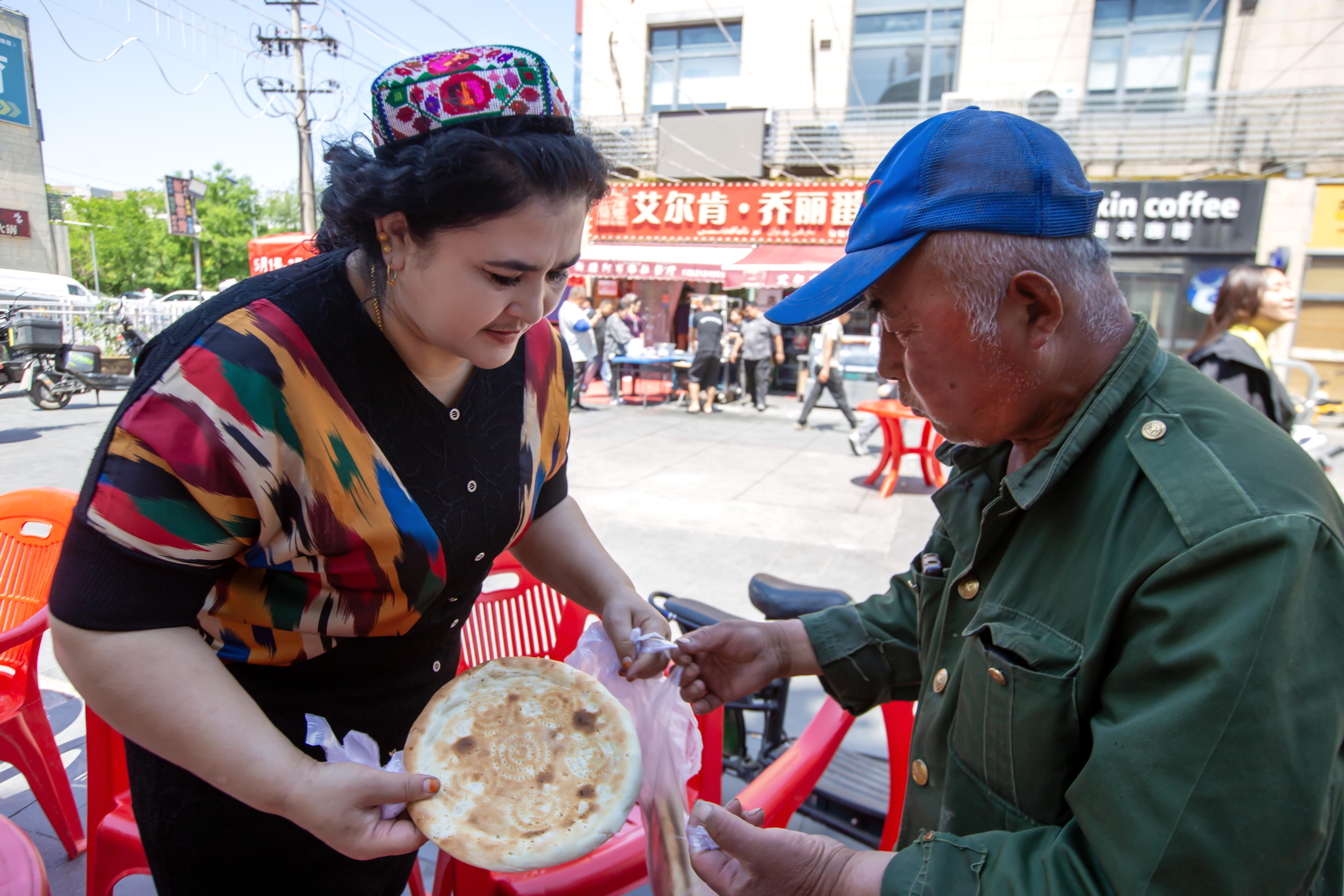 女店主乔丽帕娜依•热合木给58岁的环卫工王金明大哥往食品袋里放几个新疆的馕,让他带回去,让家人分享。