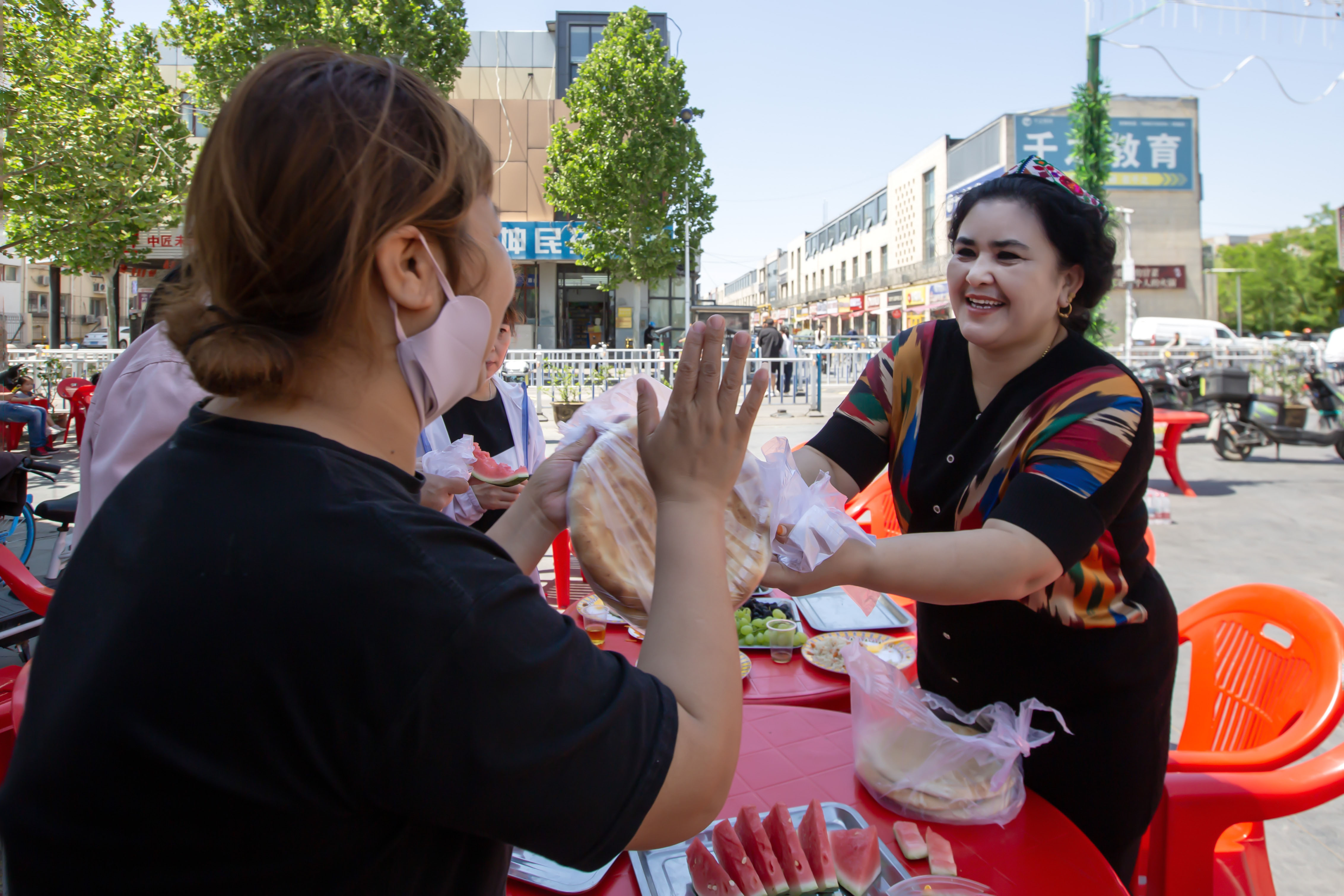 2025年5月2日,天津市西青区精武镇富家湾,“维族大姐”乔丽帕娜依•热合木(左)与店员阿得拉木•哈得尔江正在把香喷喷、
