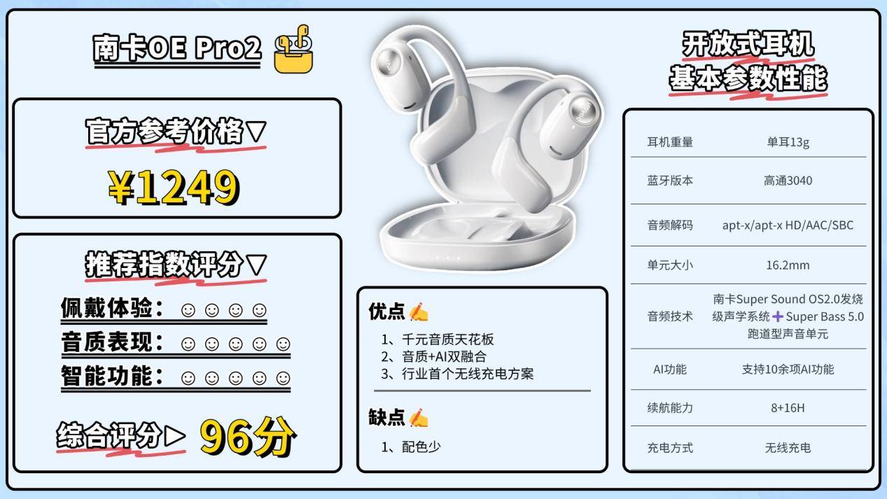 南卡在开放式耳机领域作为开创者和专业度最高的代表,专注深耕开放式声学技术已超过13年。凭借AI全能助手、0压0感的舒适佩戴体验、澎湃细腻的音质表现和旗舰级配置,南卡OE Pro2长期稳居开放式耳机品类的第一梯队。它从未依赖广告或明星代言,而是凭借真实的产品力收获了Hi Fi发烧友、数码达人和业内人士的一致推荐,每一代新品上线都能在极短时间内赢得市场认可。目前也成为了目前开放式耳机中的TOP1品牌,与BOSE、森海塞尔等高端音频品牌齐名的国产代表。