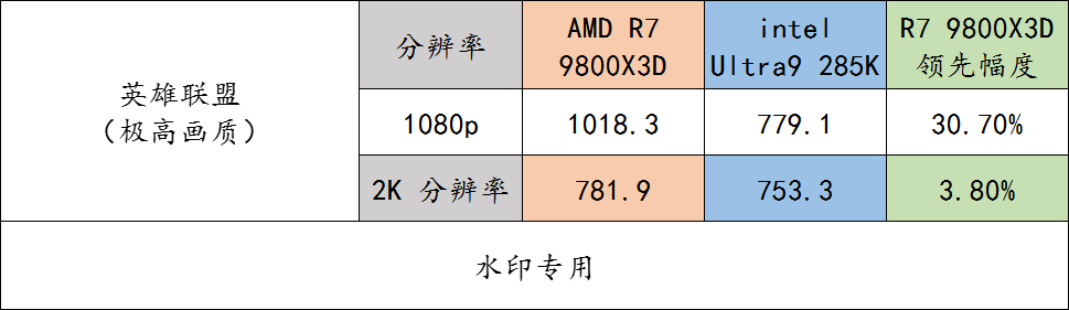 9800X3D 在 1080p 下领先 Ultra 9 285K 30.70% 的游戏流畅度。在 2K 分辨率 下领先 Ultra 9 285K 3.80% 的游戏流畅度。