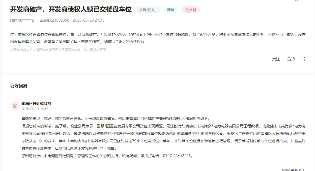 彼时,官方回复称是因开发商无法按时结清佛山市南海多宝电力电器有限公司工程款项,法院以以资抵债的形式将桂丹颐景园的部分车位裁定给该公司。
