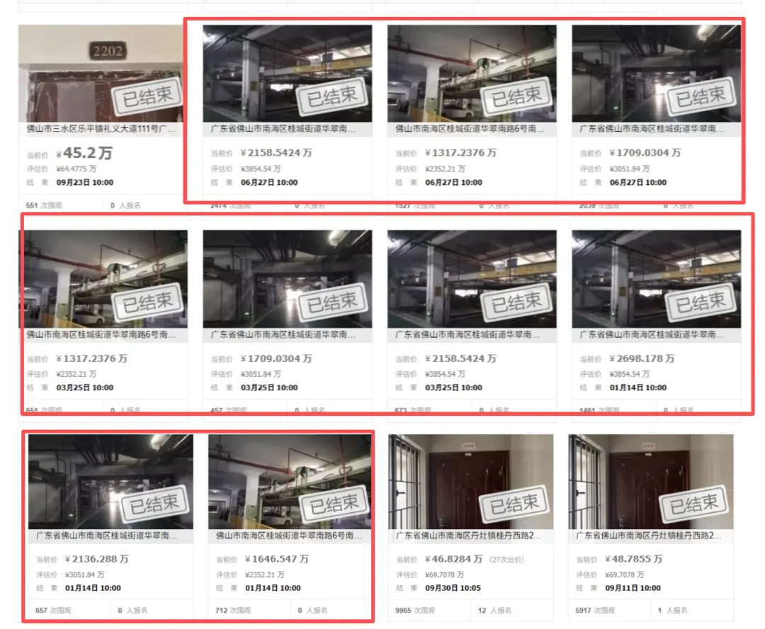 另外,楼市君搜索发现,南海颐景园北区地下车库机械车位A、B、C自今年1月至6月期间,曾连续三次挂网拍卖,总起拍价从6481万降至5184万,但均全部流拍。