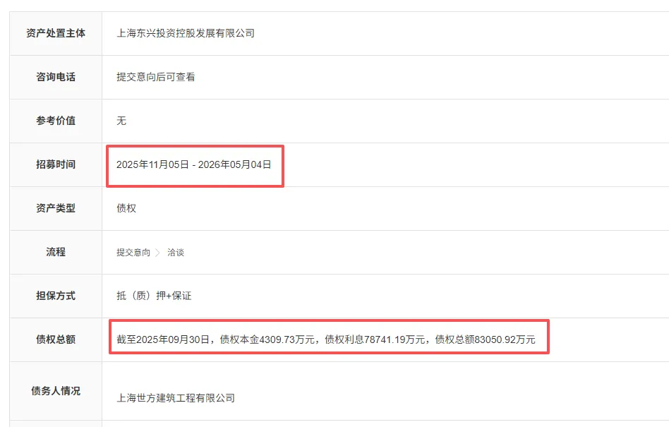 公告显示,资产招募时间为2025年11月05日-2026年05月04日,截至2025年09月30日,债权本金4309.73万元,债权利息78741.19万元,债权总额83050.92万元。