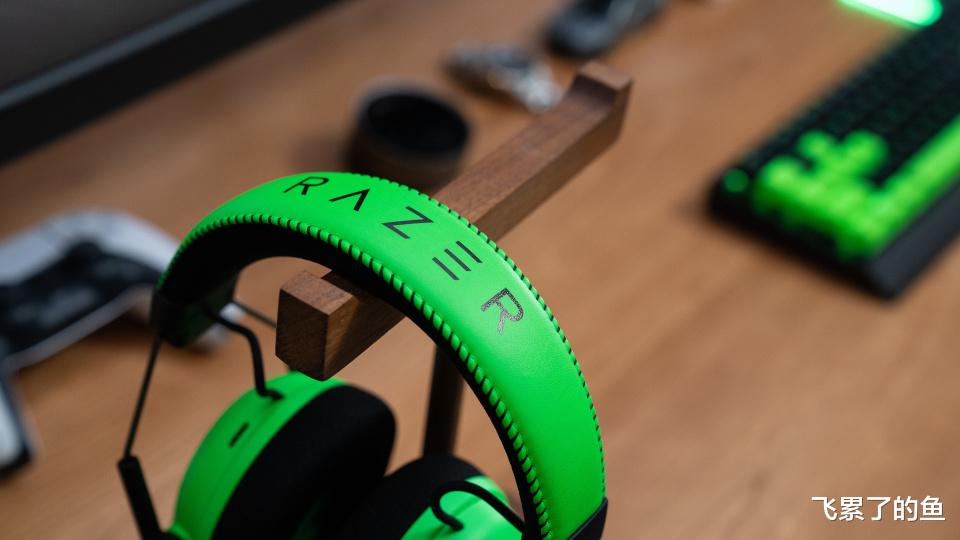 首先,它那宽大的头梁就细节满满,一方面大面积的电竞绿+超大“RAZER”logo的组合分外吸睛,看似粗犷的缝线设计,进一步增加了耳机的设计感。