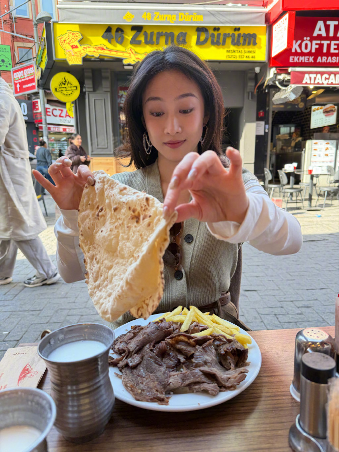 她举着刚递来的薄饼,指尖蹭着饼边的热香,街头的喧闹裹着她的笑,连外套的褶皱都透着随性。换在重庆的巷弄里,她大抵也会这样举着一份小吃,挤在烟火气里晃;可这会土耳其的街头,薄饼的暖、人群的闹,都裹着和重庆巷弄一样的 “不用绷着”,她的笑没了镜头前的娇,只剩接食物时的自然雀跃。