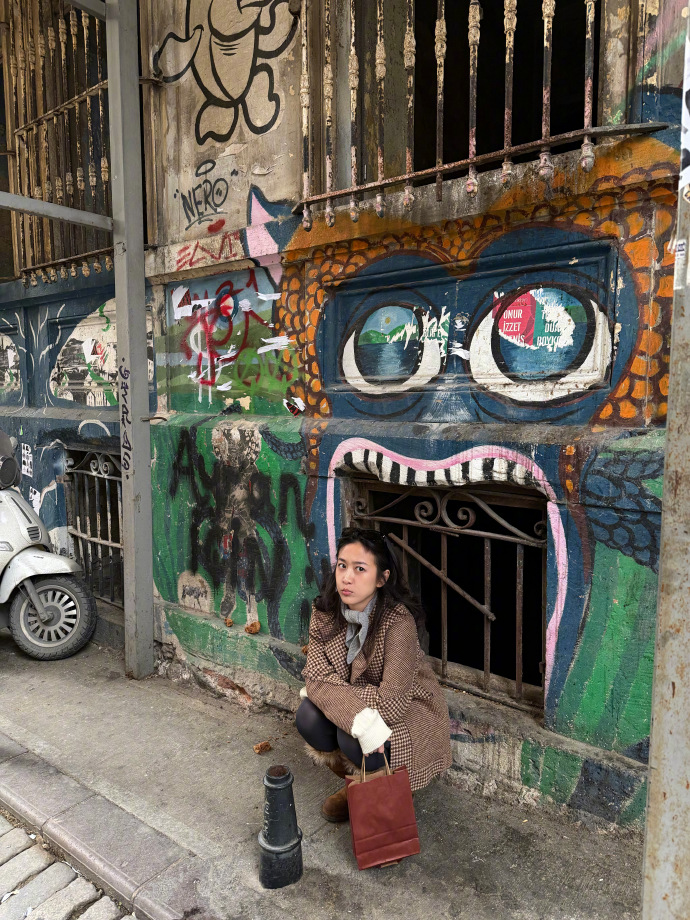 她半倚在涂鸦墙旁,墙面的蓝眼图案透着街头的野,头发松松垂着,连姿势都没半分刻意。重庆的老巷里,也有这样爬满涂鸦的墙,她大抵也会这样懒懒散散地靠;可这会土耳其的墙下,涂鸦的跳脱、她的松弛,都像重庆巷弄里的 “随便站站就好看”,没有镜头前的设计感,只有街头的随性。