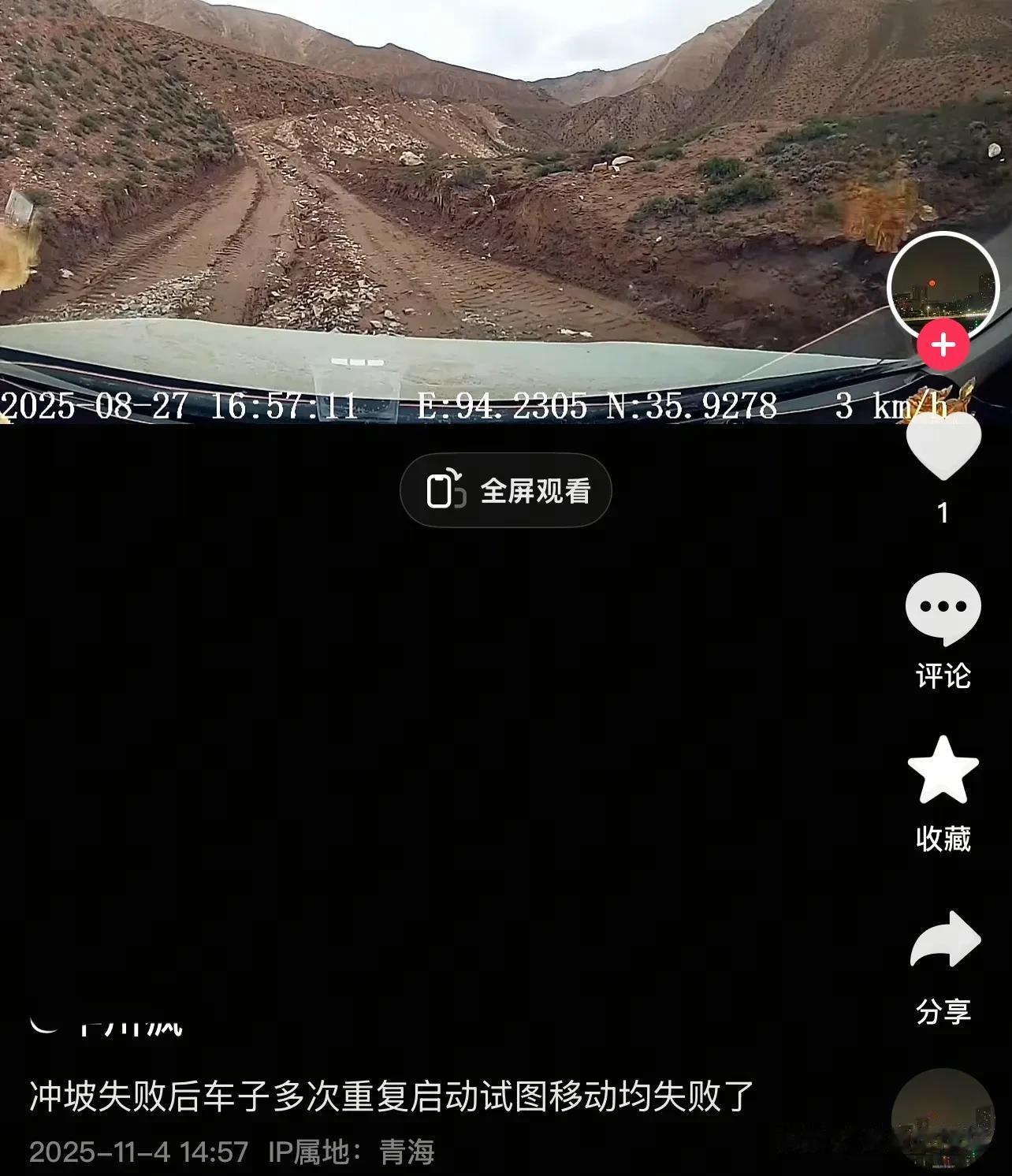 这条小路特别难走,前面有一个大坡,钟先生尝试冲上山坡,但是失败了,车子彻底困住,熄火后,行车记录仪便停止录像。