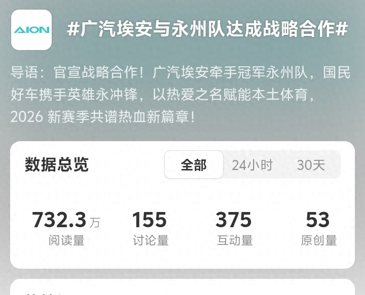 近日#广汽埃安与永州队达成战略合作#登上了热搜。阅读量超七百多万。