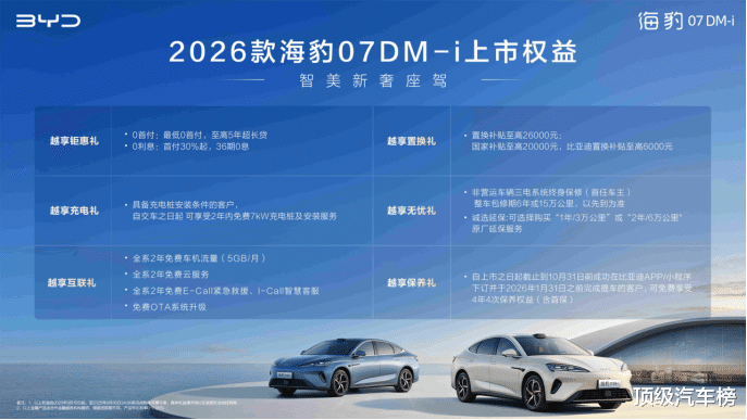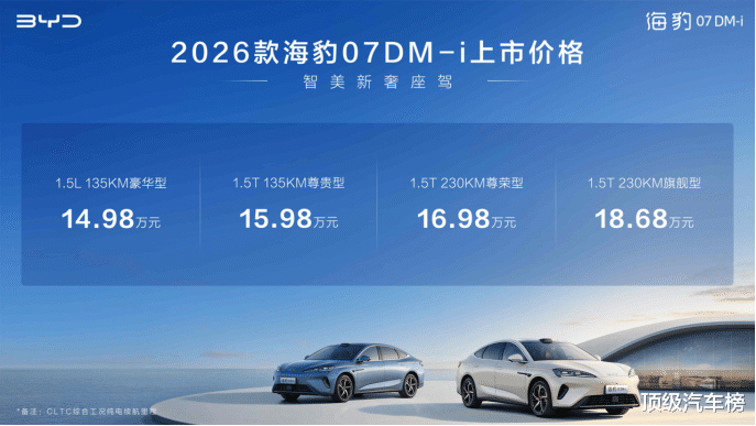 9月15日,智美新奢座驾——2026款海豹07DM-i正式上市,新车共推出4个配置版本,官方指导价格为14.98万元-18.68万元,并推出越享钜惠礼、越享置换礼等六重购车礼遇。2026款海豹07DM-i在“智能、舒适、性能、颜值、安全”五大维度全面进阶,基于全新一代插混整车平台打造,新增云辇-C 智能阻尼车身控制系统、TSC高速爆胎稳定控制系统及天神之眼 B - 辅助驾驶激光版(DiPilot 300)等硬核黑科技,为用户带来高品质出行新体验。