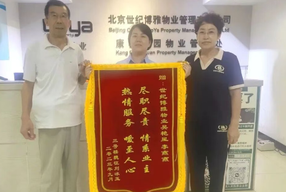 康都3-3-XX户业夫妻俩,来到康都物业的前台,送上一面印着“尽职尽责 情系业主 热情服务 暖至人心”的锦旗,亲手交到楼管员李燕燕手中,盛赞燕燕的服务精神。