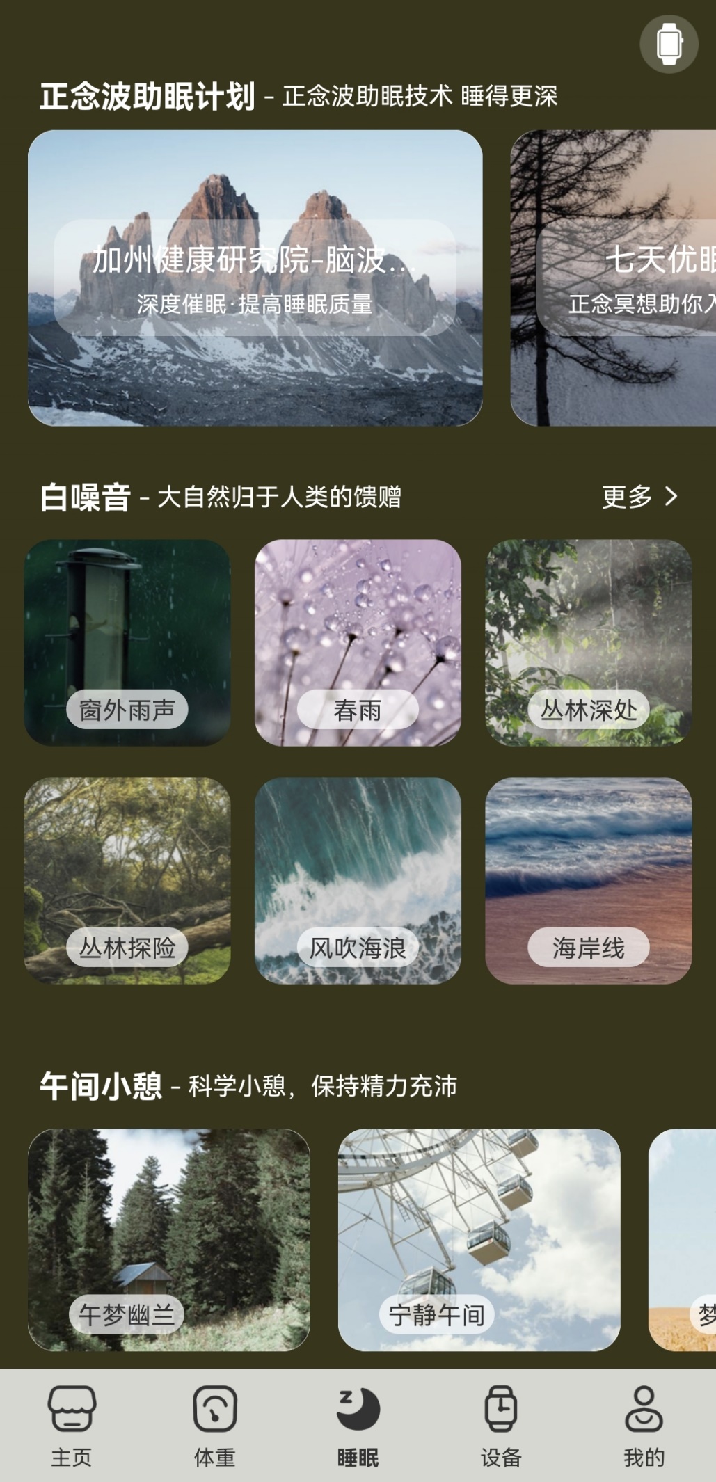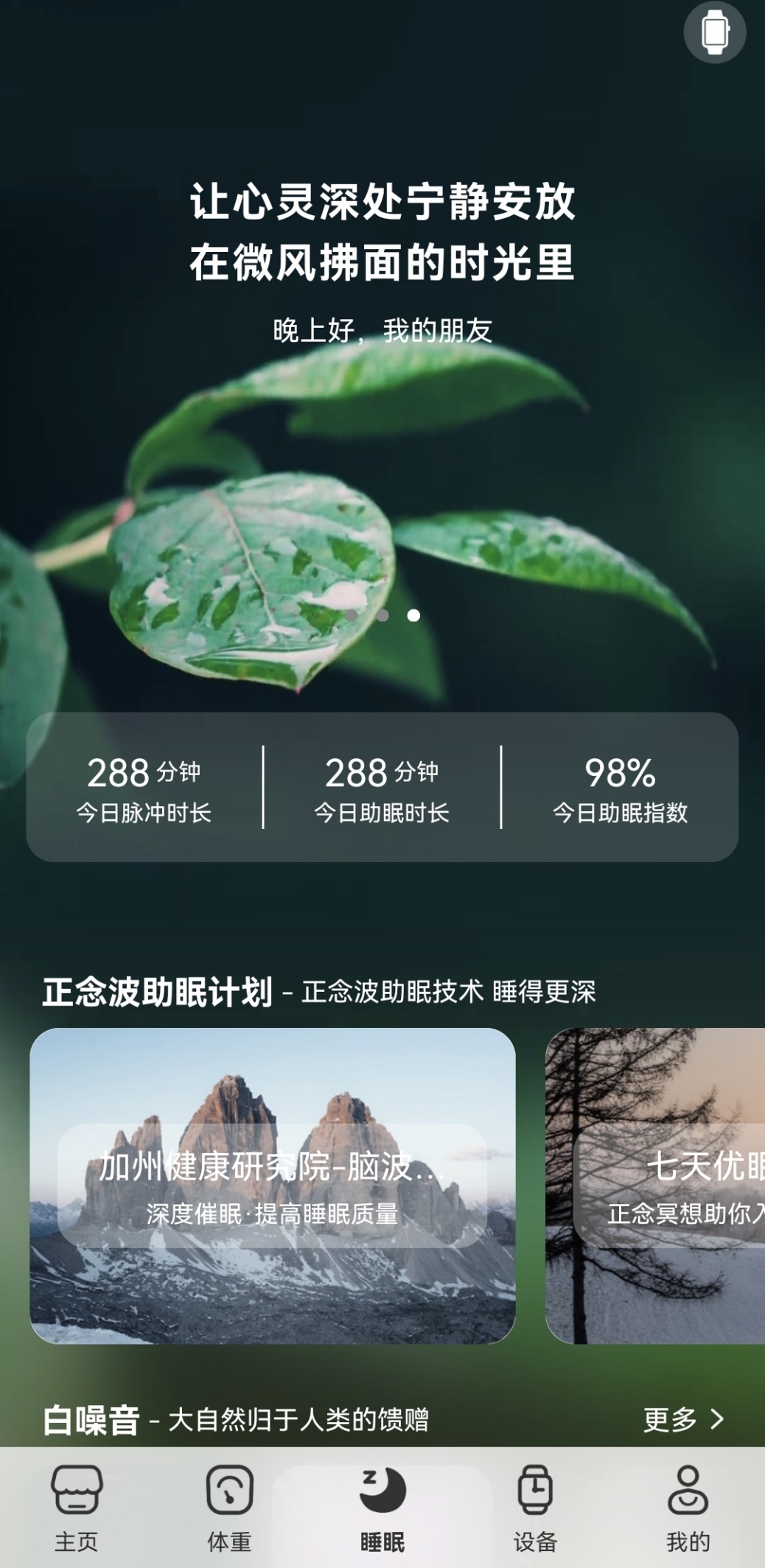 此外, dido P1S PRO还为我们提供了一个专门的“助眠表盘”,点击表盘上的睡眠辅助,即可开启助眠模式,非常方便。