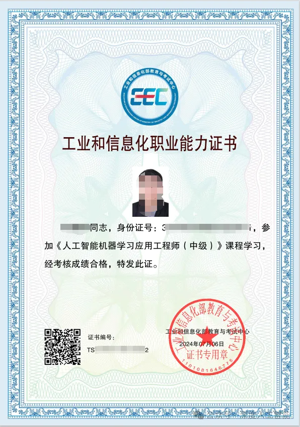 学习完本课程,并通过考试,将会获得由工业和信息化部教育与考试中心颁发的《人工智能机器学习应用工程师(等级)》职业能力证书。