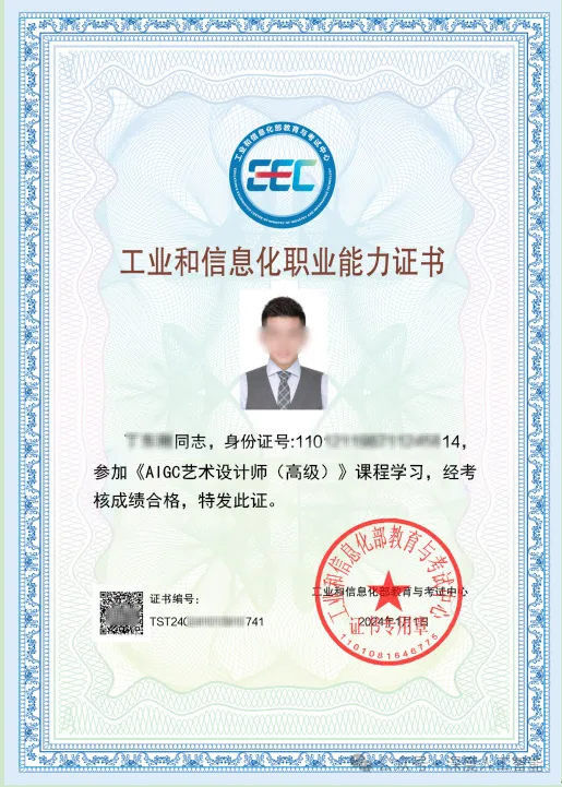学习完本课程,并通过考试,将会获得由工业和信息化部教育与考试中心颁发的《AIGC艺术设计师(等级)》职业能力证书。