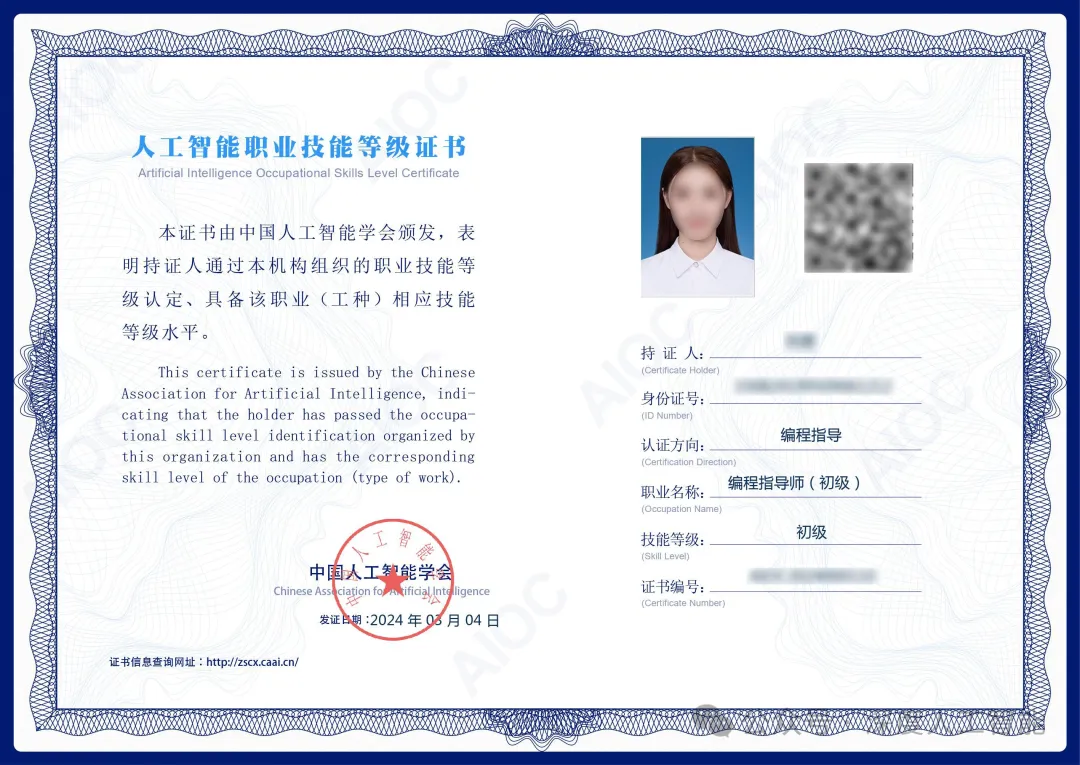 学习完本课程,并通过考试,将会获得由中国人工智能学会颁发的《编程指导师(等级)》职业技能等级证书。
