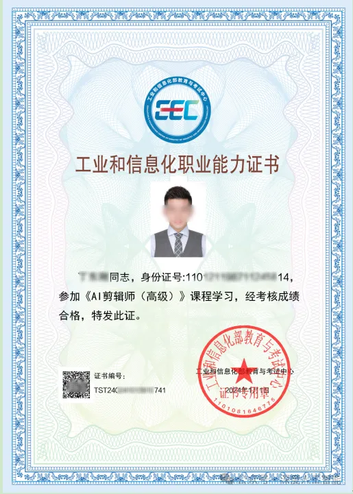 学习完本课程,并通过考试,将会获得由工业和信息化部教育与考试中心颁发的《AI剪辑师(等级)》职业能力证书。