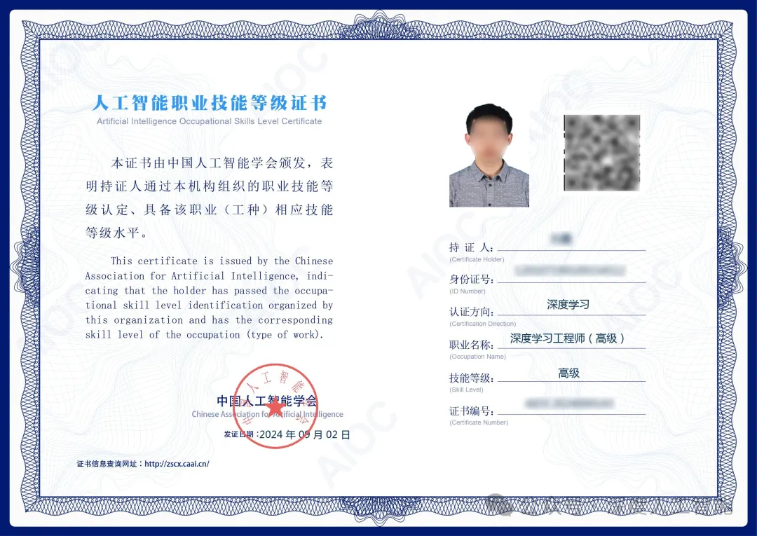 学习完本课程,并通过考试,将会获得由中国人工智能学会颁发的《深度学习工程师(等级)》职业技能等级证书。