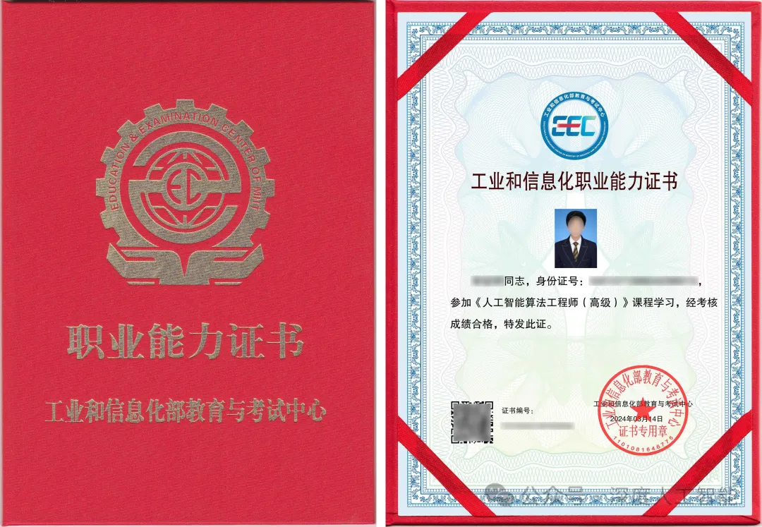 学习完本课程,并通过考试,将会获得由工业和信息化部教育与考试中心颁发的《人工智能算法工程师(等级)》职业能力证书。