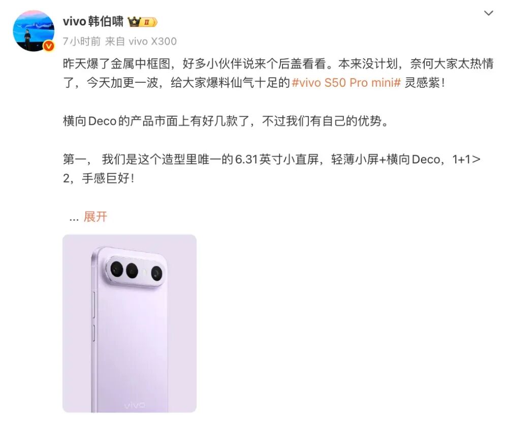 vivo通信科技有限公司产品经理韩伯啸在最新预热中展示了vivo S50 Pro mini灵感紫配色外观,并表示“横向Deco的产品市面上有好几款了,不过我们有自己的优势。”
