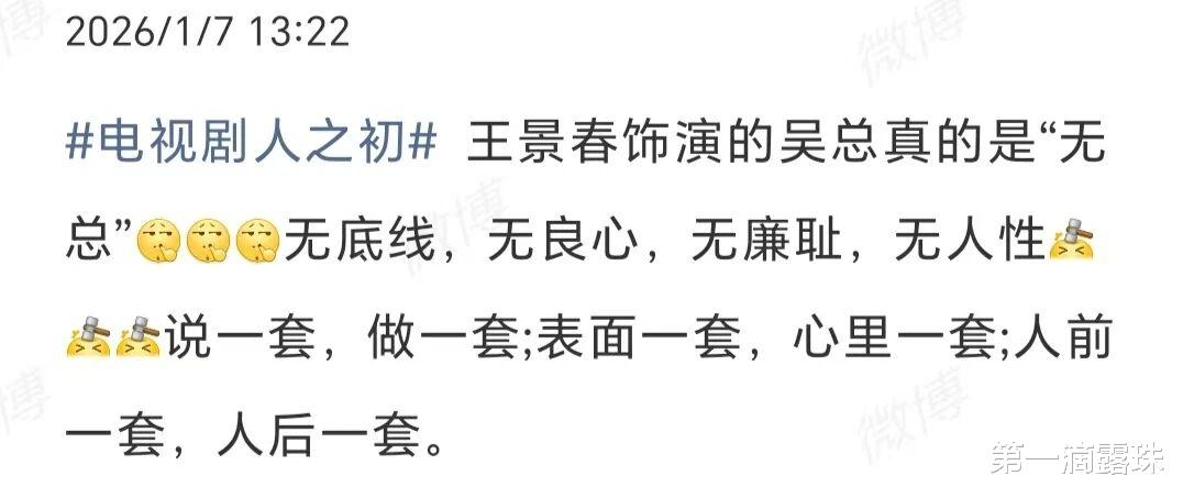 有一位观众是这样评价吴国豪的:王景春饰演的吴总真的是“无总”:无底线,无良心,无廉耻,无人性。说一套,做一套;表面一套,心里一套;人前一套,人后一套。