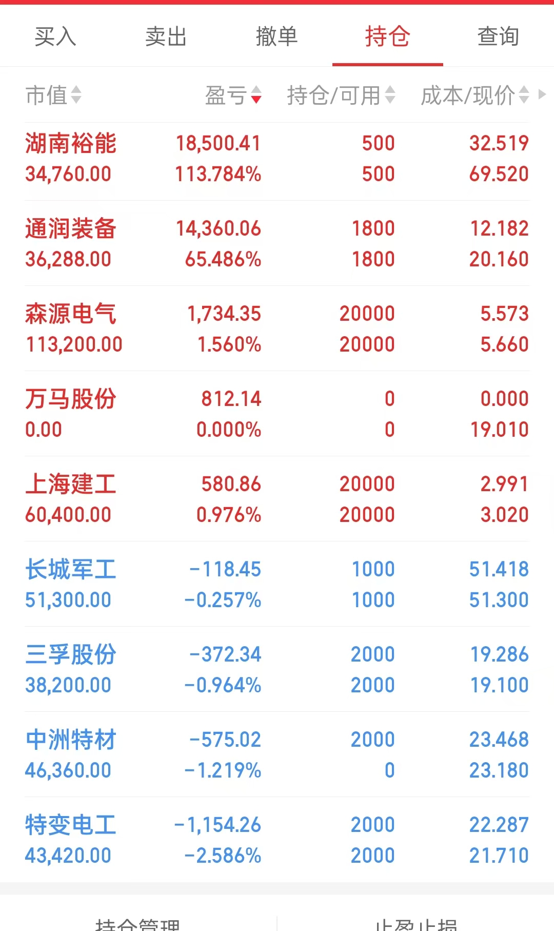 持有:湖南裕能,通润装备,森源电气,上海建工,中洲特材,长城军工,三孚股份,特变电工