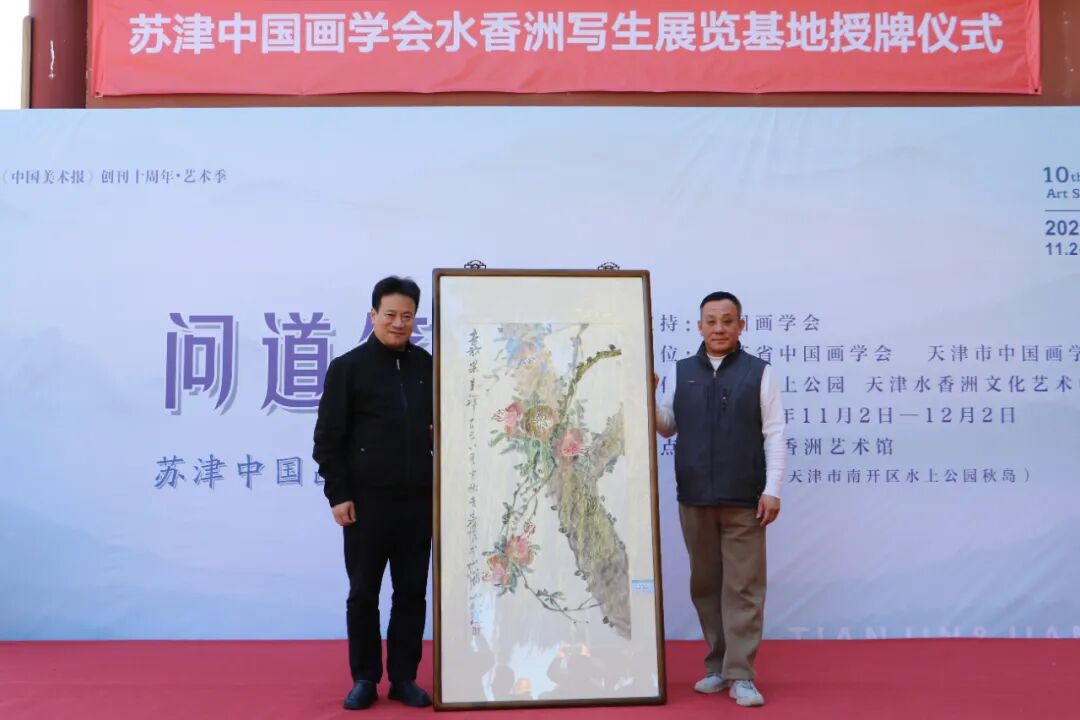 仪式现场还上演温情一幕:翟优代表江苏省中国画学会向水香洲文化艺术中心捐赠画作,以笔墨佳作传递两地艺术家的深厚情谊。随后,孙克、殷福、霍春阳、高云共同为两大写生交流展览基地揭牌,标志着苏津两地中国画领域的合作从“单次联动”迈向“常态化、机制化”新阶段。最后,孙克宣布展览正式开幕,全体嘉宾共同合影,将这一见证南北艺脉交融的重要时刻永久定格。
