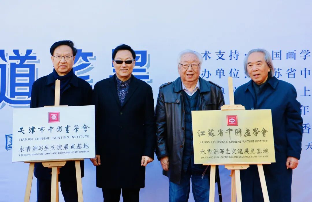 整场开幕式流程紧凑有序,亮点迭出,彰显浓厚学术氛围与文化温度。霍春阳、翟优、水香洲文化艺术中心董事长刘建洞先后登台致辞,分别从中国画笔墨精神的传承脉络、苏津地域艺术风格的互鉴价值、文化交流平台的搭建意义出发,深刻阐释了本次展览的学术内核与时代价值。致辞环节后,现场举行基地合作协议签订仪式:江苏省中国画学会副会长王平、天津市中国画学会副秘书长王爱宗,分别与刘建洞签订合作协议,正式成立“江苏省中国画学会水香洲写生交流展览基地”与“天津市中国画学会水香洲写生交流展览基地”,为两地艺术界长期互动、深度合作奠定坚实基础。