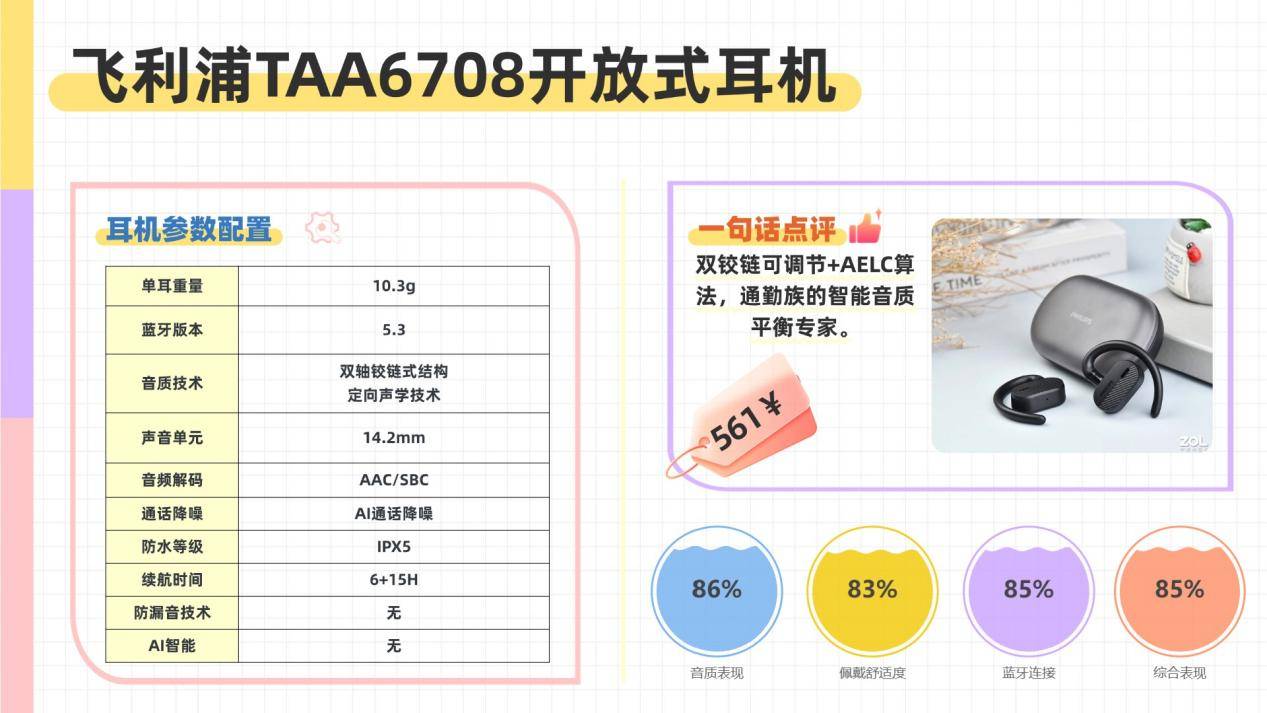 在开放式耳机市场中,飞利浦TAA6708凭借独特设计与技术优势占据一席之地。它采用双向铰链调节结构,能灵活适配不同耳型,亲肤硅胶耳挂不仅让运动时佩戴稳固,日常使用也能保持舒适体验。