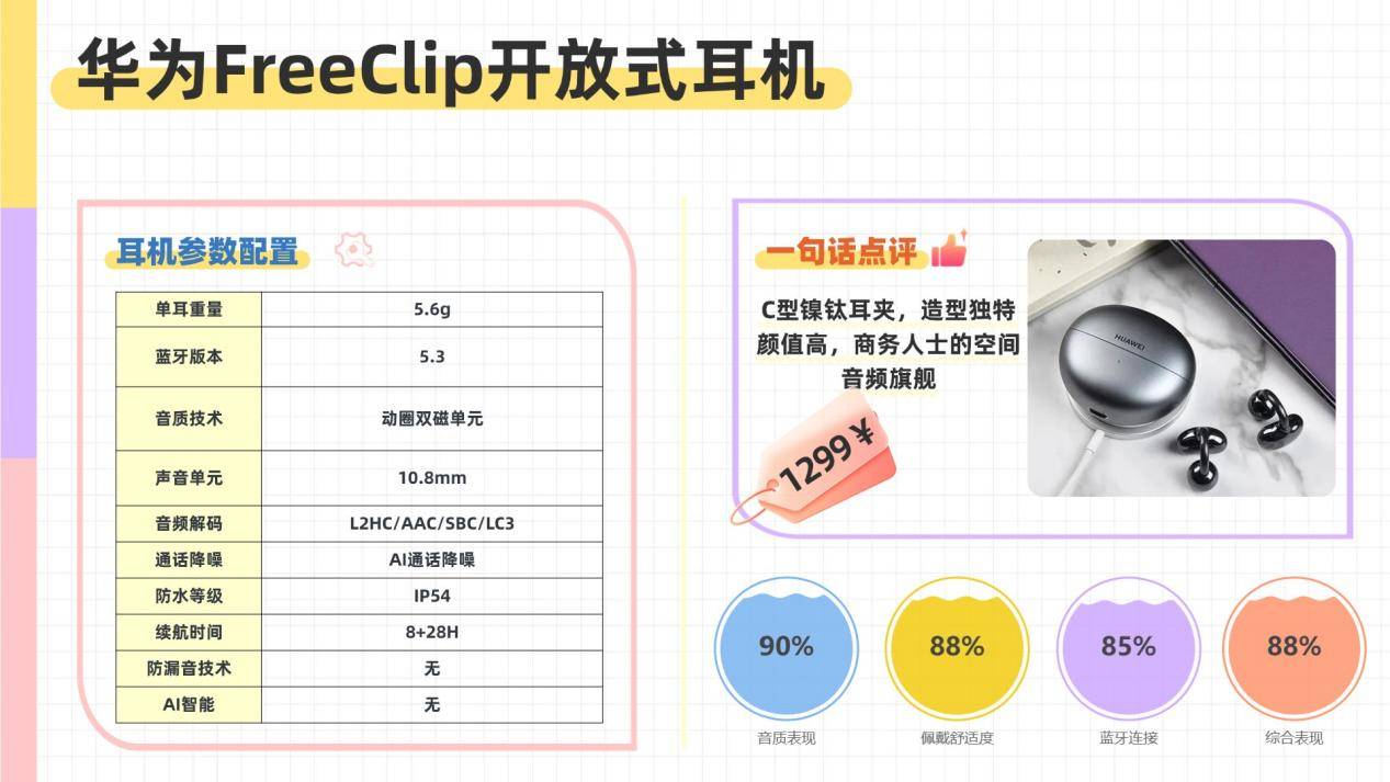 音质方面,FreeClip搭载10.8mm双磁路声学单元,融合华为自主研发的空间音频技术及头部追踪功能,能实现小于1°的精准动态校准。无论是观影还是听音乐,声场都会随头部转动自动调整,为用户带来更强的沉浸式听感。