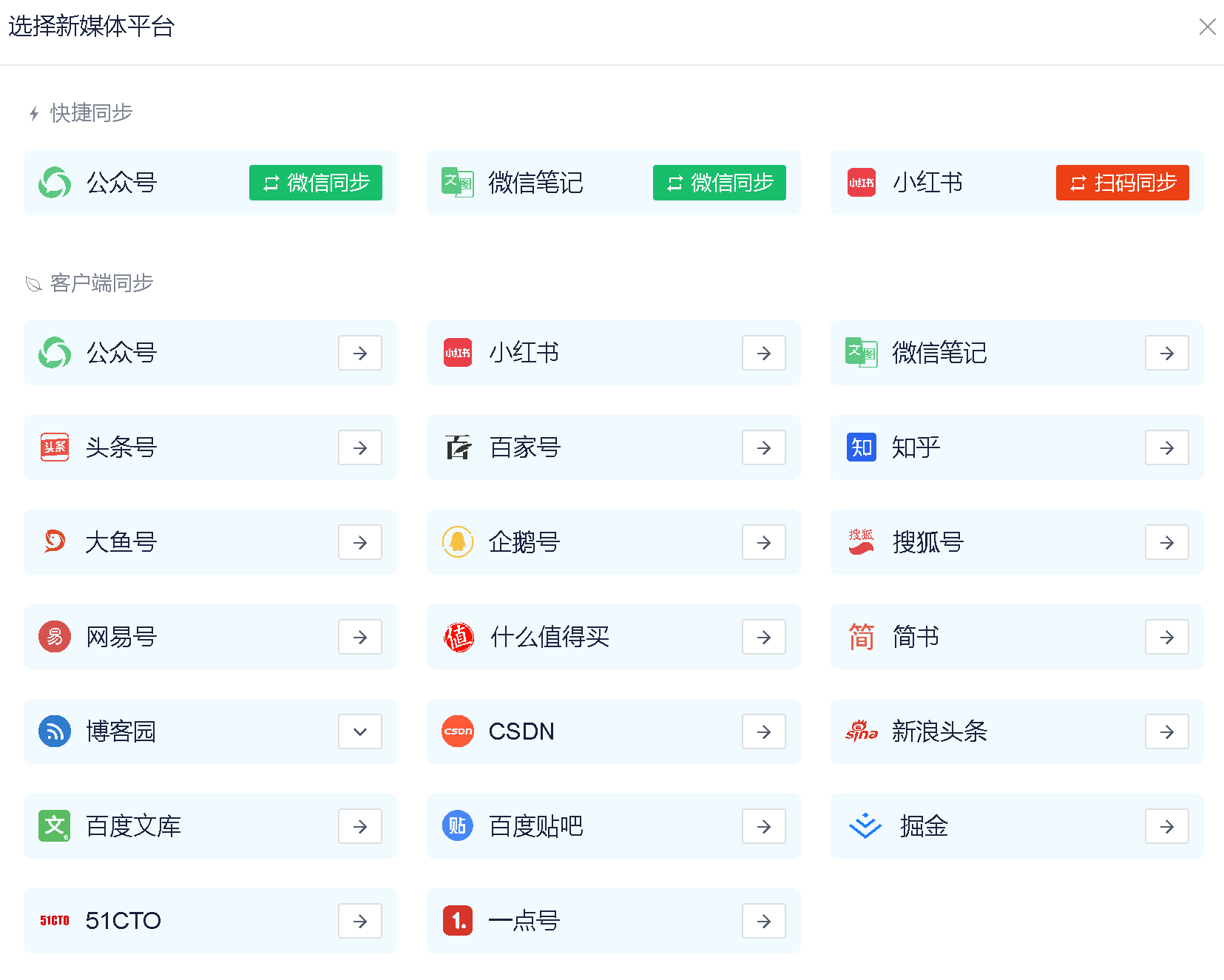 一键同步至 20+ 主流平台(包括公众号、百家号、头条号、知乎、搜狐号等);