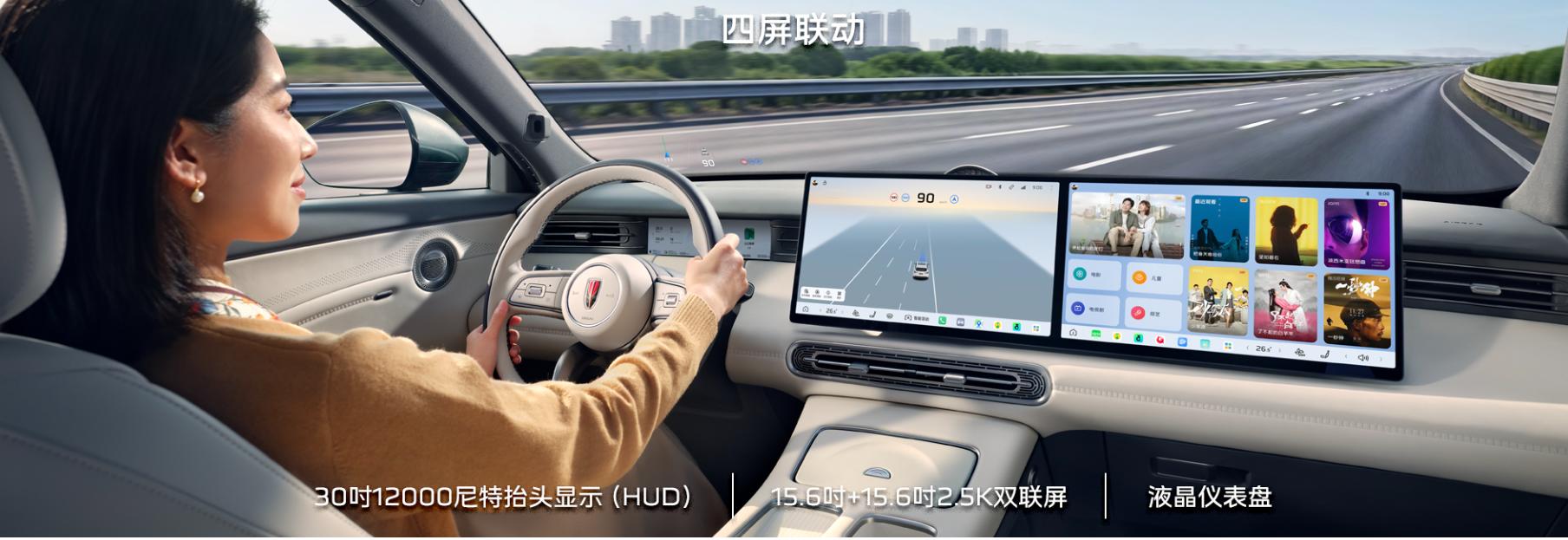 智能配置方面,红旗 HS6 PHEV 的 “灵犀座舱” 让人眼前一亮。全系标配 15.6+15.6 英寸的 2.5K 双联屏,再加上仪表屏,四块屏幕联动流畅,显示清晰,科技感十足。内置的红旗自研 “灵犀” 车机系统,用了行业优选的高通 8295P 芯片,操作起来丝滑流畅,没有卡顿,响应速度特别快。