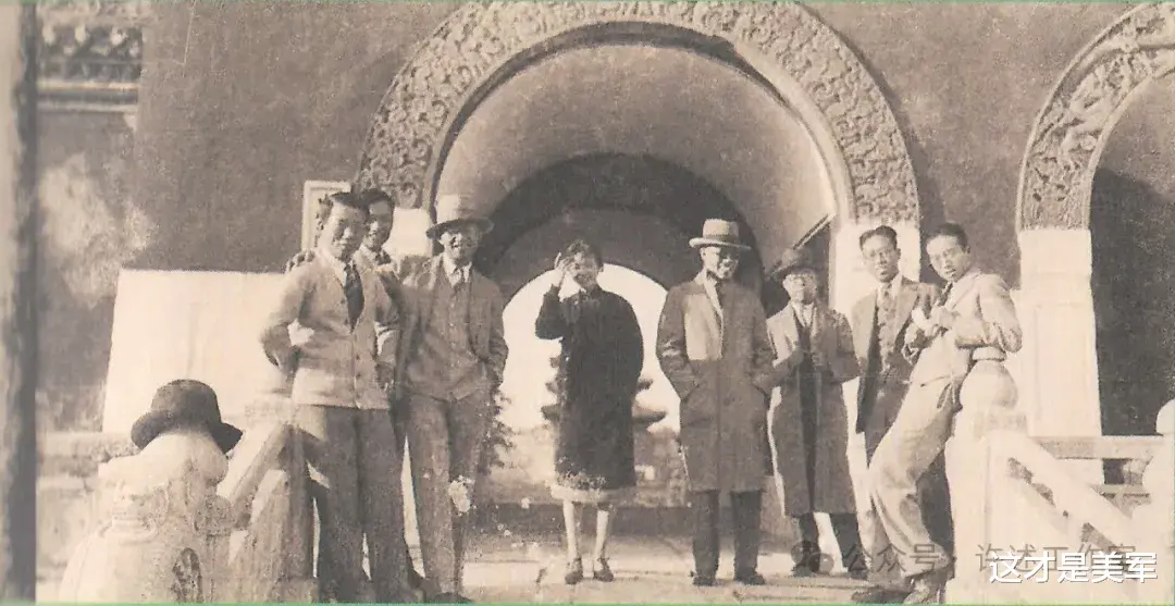 26岁,我(中)、思成(右一)与东北大学教师合影 1930年摄于沈阳北陵(清昭陵)正红门前