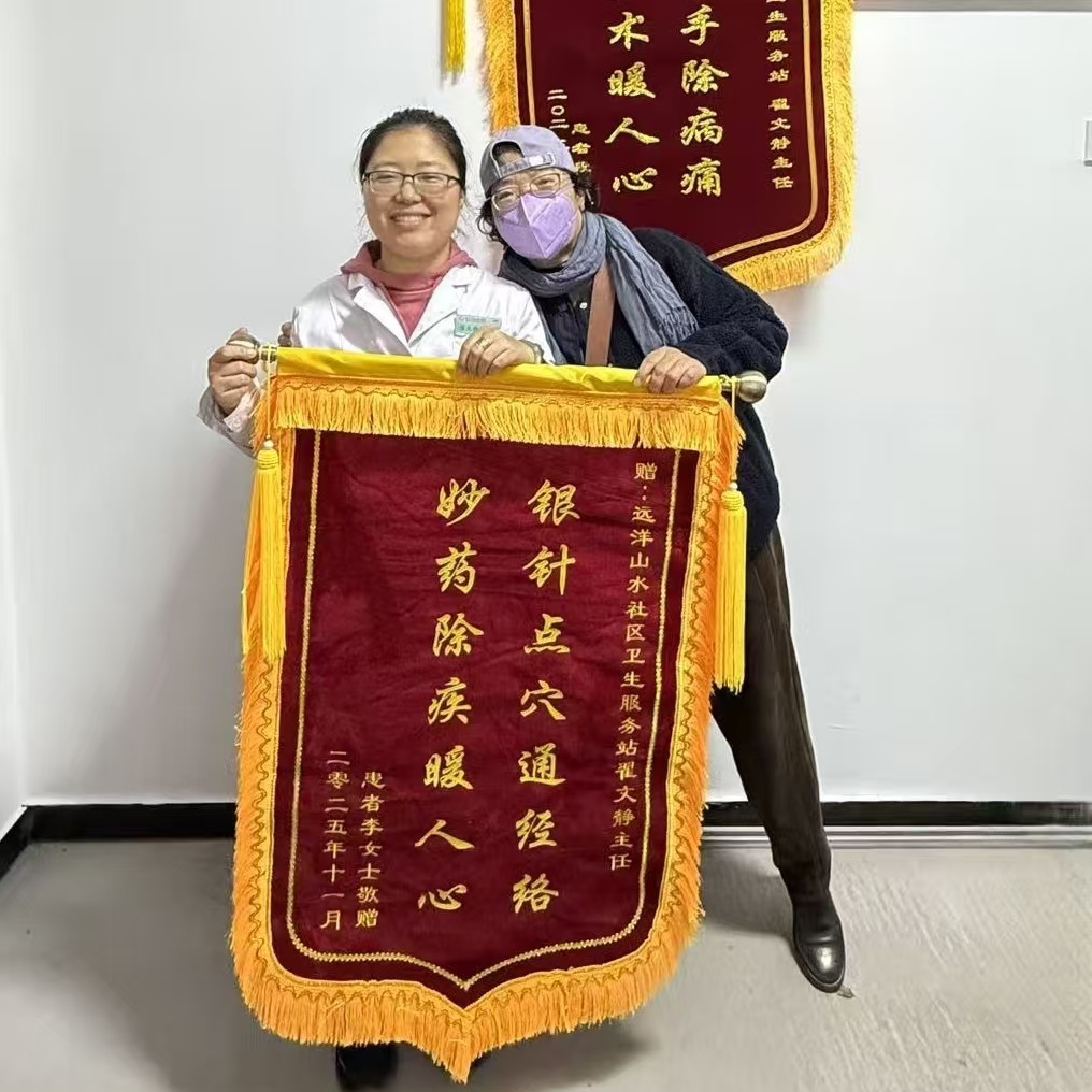 日前,社区居民李女士专程来到远洋山水社区卫生服务站,将两面绣着暖心话语的锦旗,送到翟文静医生手中,以此感谢她用银针灸法与贴心服务缓解了自己的病痛。