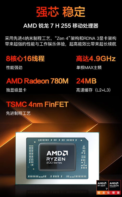 搭载锐龙 7 H 255 处理器,搭配 32GB 5600MHz 高速内存与1TB硬盘,AMD核显加持下,多任务并行、文档编辑、轻度图形处理都能流畅运行。内存与硬盘可后期升级,满足长期使用需求。