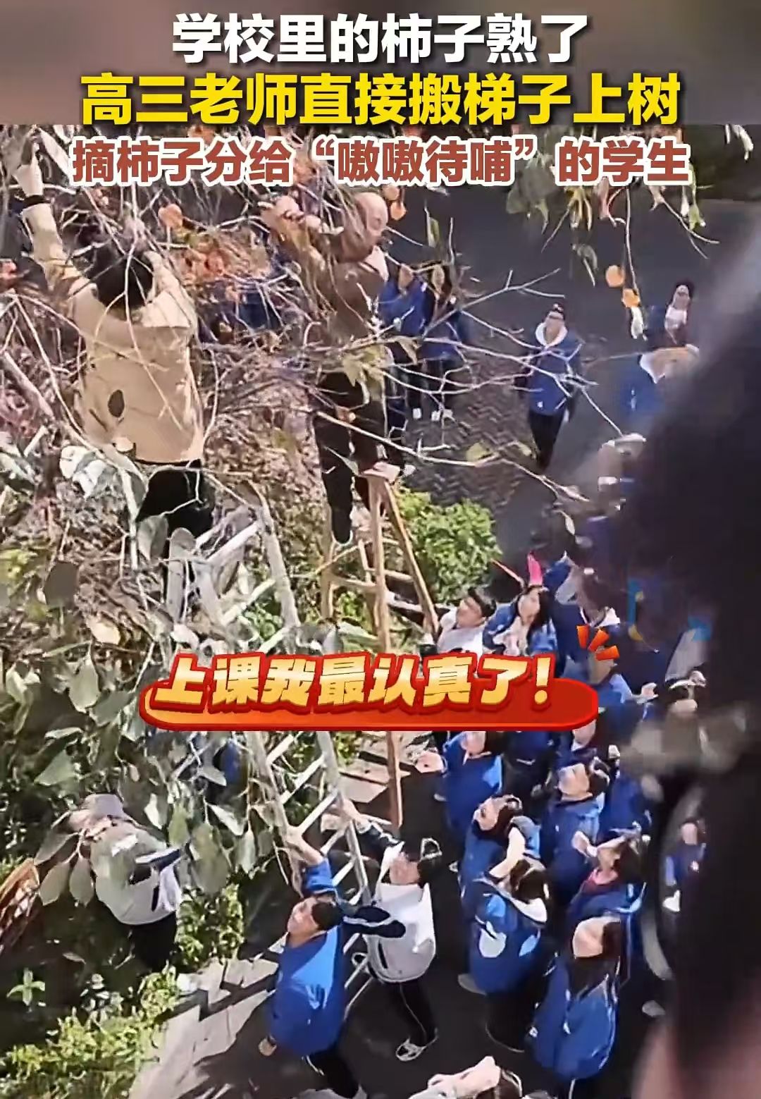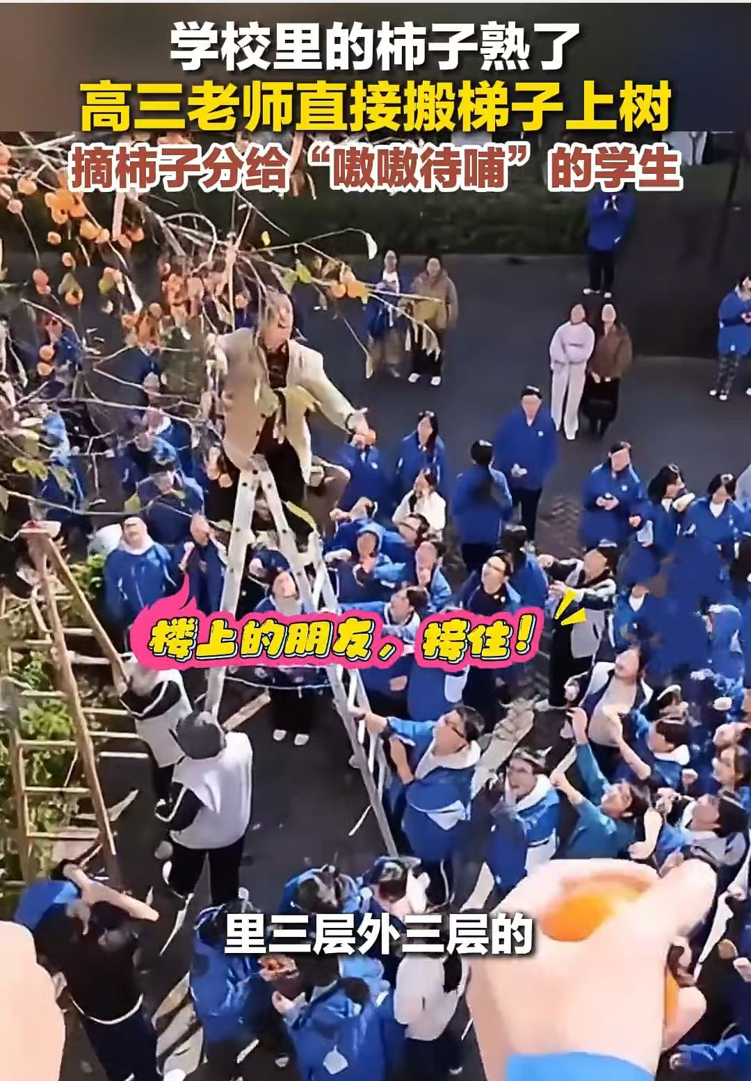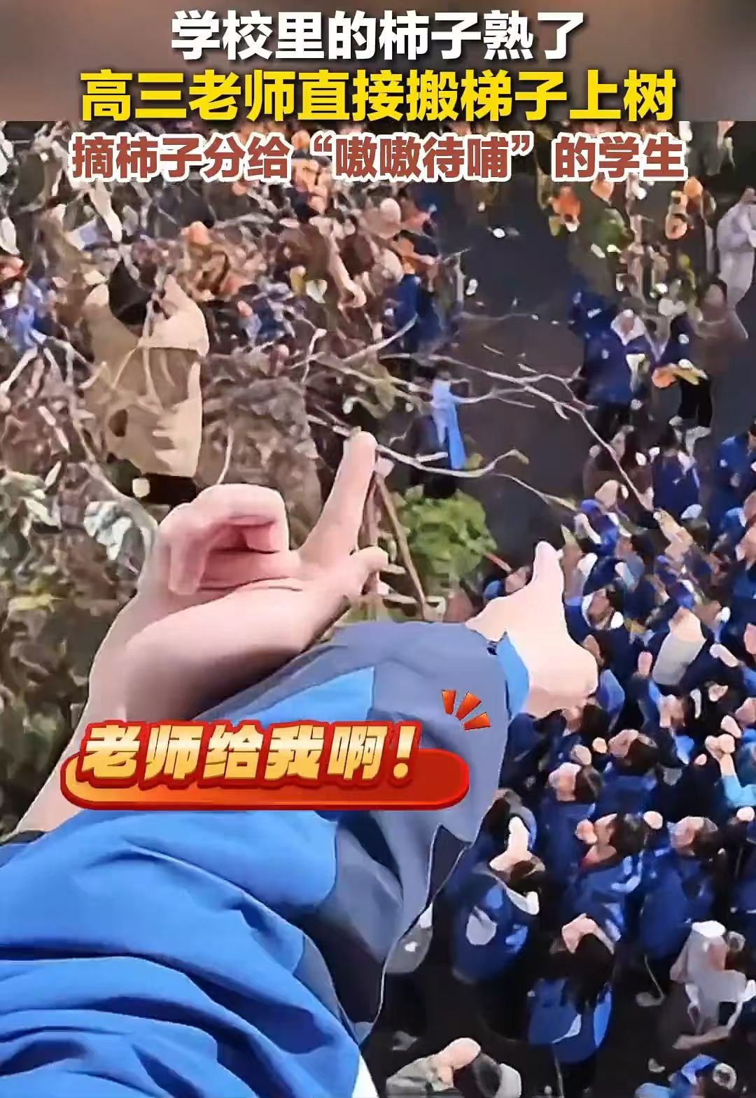 金秋时节,学校里的柿子树挂满了成熟的果实。高三的老师们见状,直接搬来梯子,化身“采柿侠”,爬上树梢摘取一颗颗金黄的柿子。老师边摘边抛给围观的“嗷嗷待哺”的学生。#班主任有多不易# #老师的那些心酸# #教师心酸一刻# #班主任放假文案#