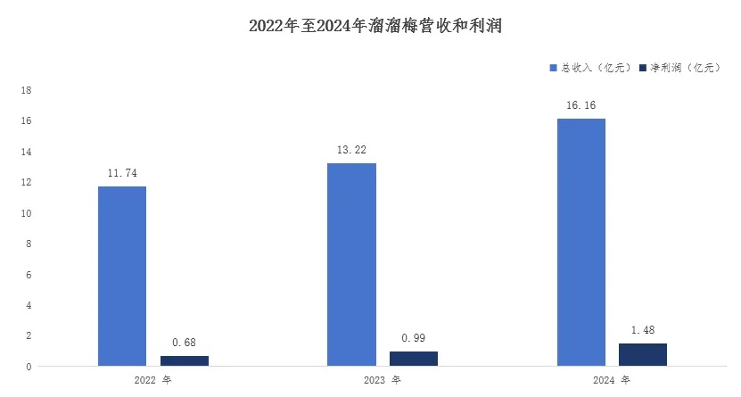 招股书显示,2022年至2024年溜溜果园总收入分别为11.74亿元、13.22亿元和16.16亿元;净利润分别为0.68亿元、0.99亿元和1.48亿元。营收和业绩双双增长的背后,离不开溜溜梅对渠道的持续变革。