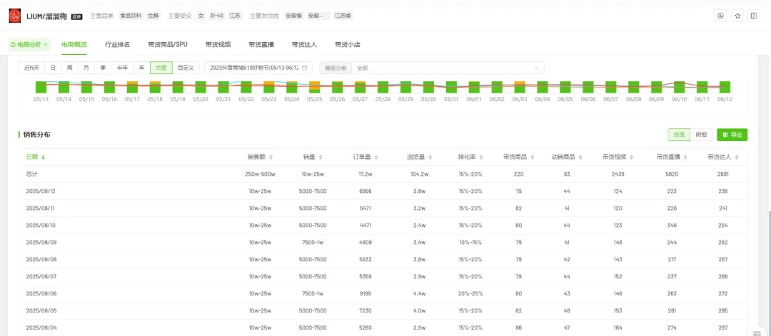 但溜溜梅需承担渠道变革带来的短期阵痛,一方面,电商平台流量分配机制和规则的调整、投流成本的上涨、直播电商休闲零食竞争的白热化,让线上能给溜溜梅贡献的收入有限。溜溜梅官方旗舰店在抖音618期间多日GMV稳定在10万-25万,甚至浏览量、带货视频、带货达人有所增加,但销售额并未迎来较大突破,出现流量与销售协同不匹配、内容效能低的问题。此外,店铺带货链接为79个~86个,但动销商品数量仅有41个~48个,整体动销率欠佳。