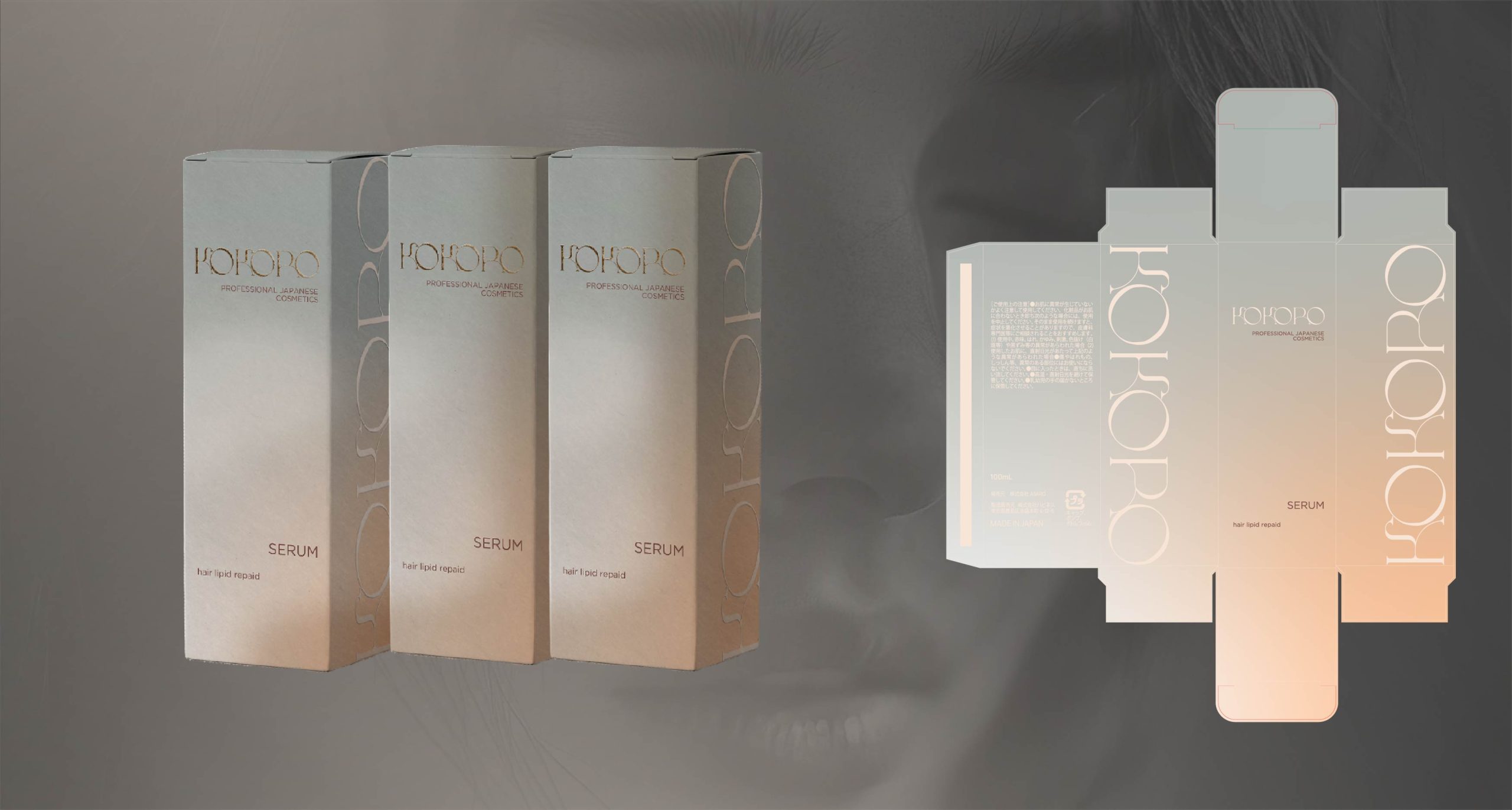 谁说护肤品包装一定要花里胡哨?KOKORO直接用“减法”杀出重围!浅灰到淡金的渐变色盒身,像极了日系美学中的“侘寂风”——低调却藏不住贵气。大字号名称以优雅字体斜向排列,既打破长方体盒子的呆板,又像在耳边轻声说“我,很特别”。最绝的是包装展开图,结构简洁到“一丝不苟”,却通过色彩过渡让“高级”二字溢出屏幕。这波操作简直是“社恐品牌”的福音——不喧哗,自有声。