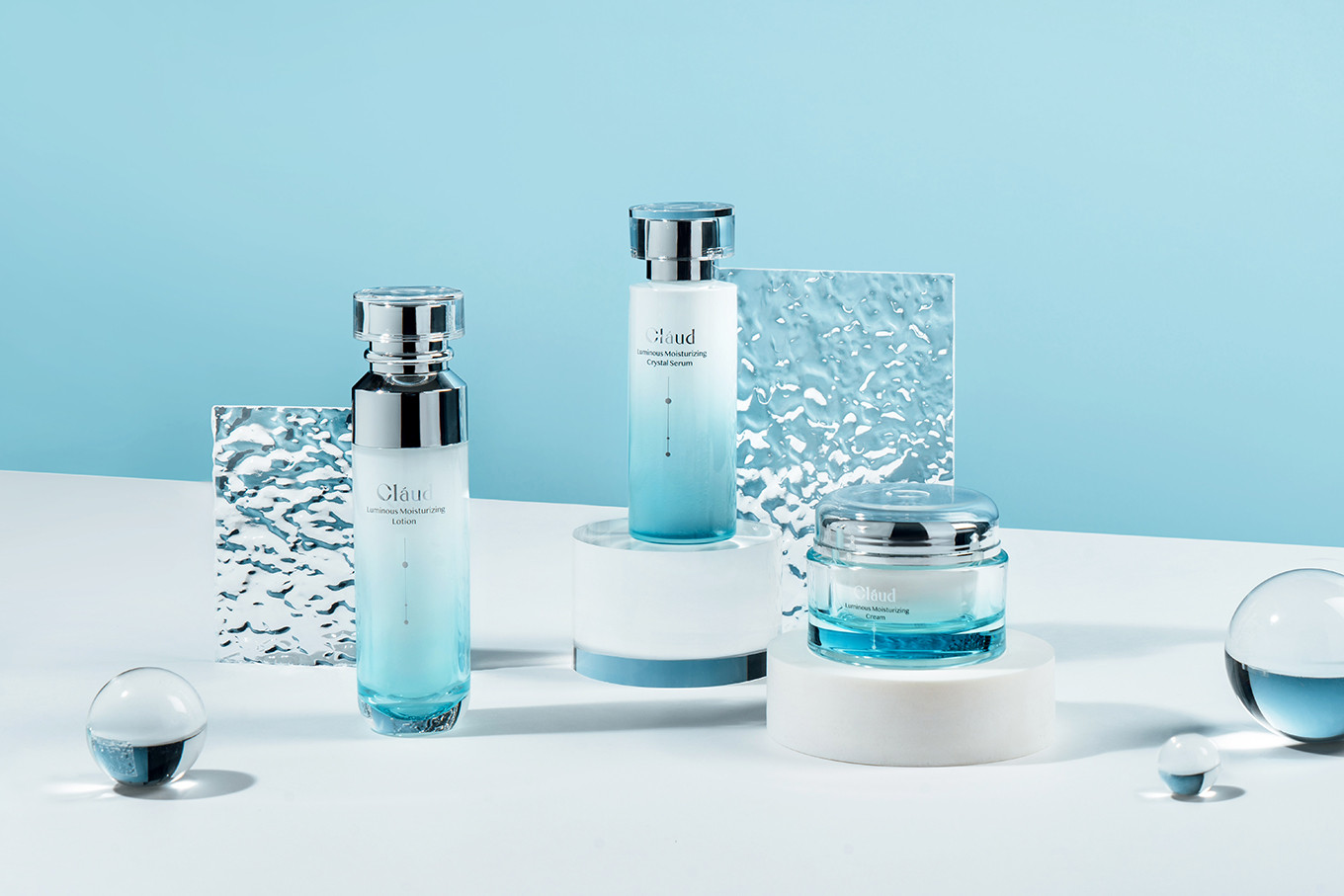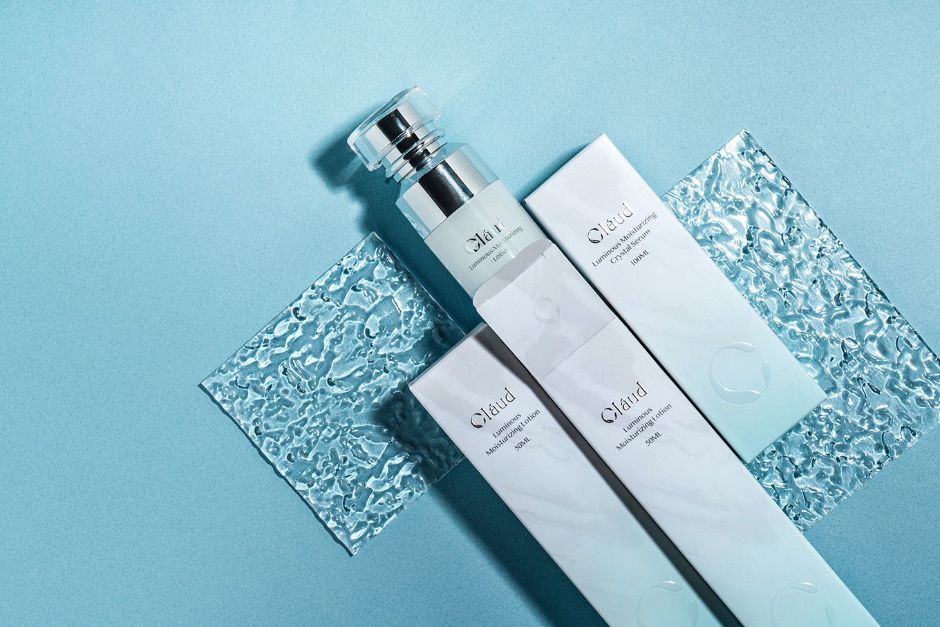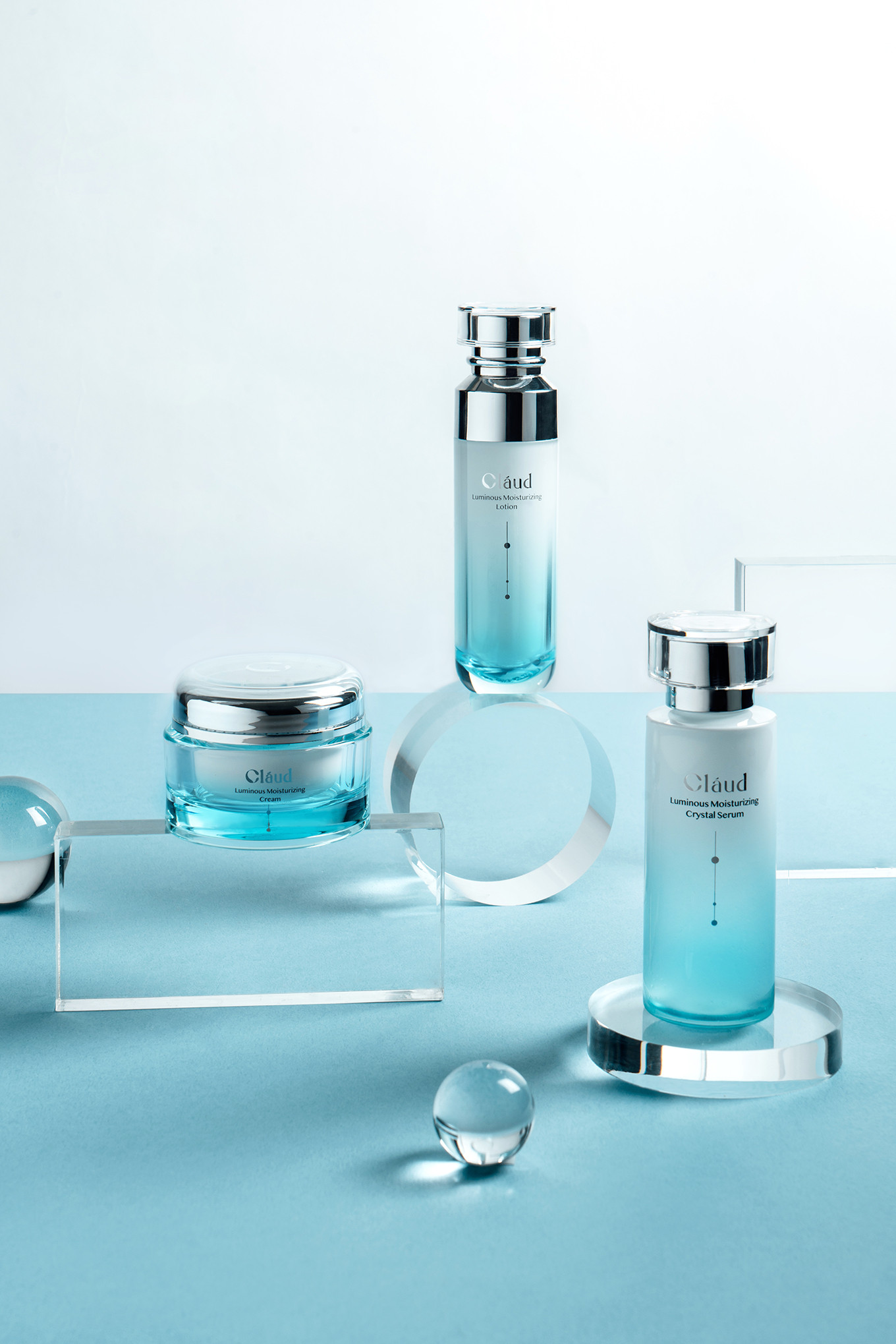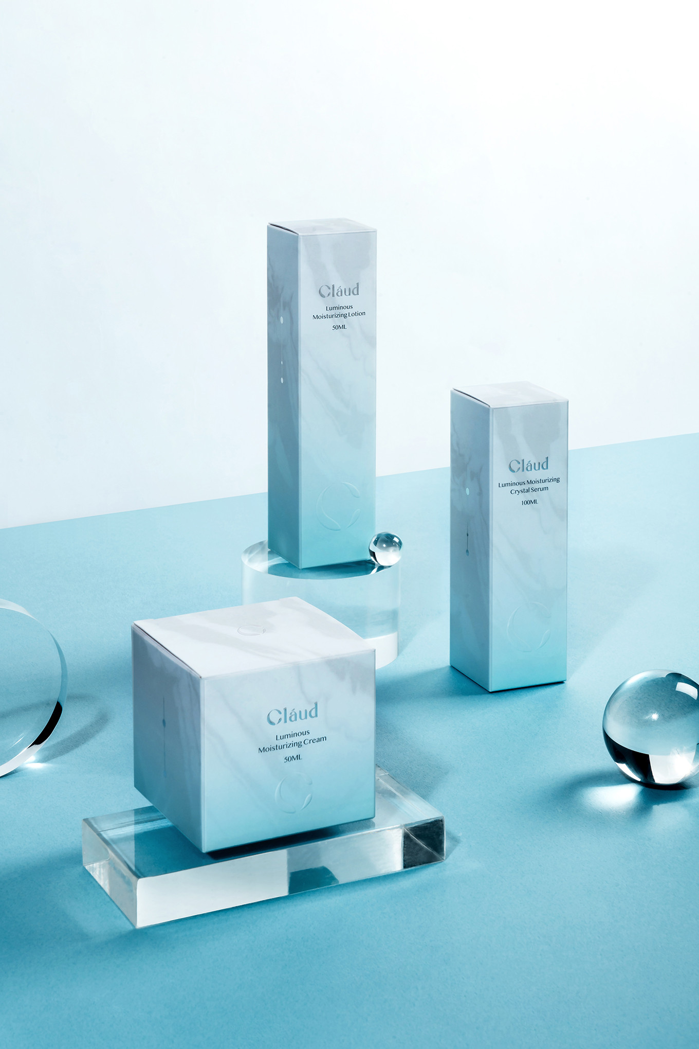 如果KOKORO是低调贵族,Claud就是水中精灵!浅蓝到透明的渐变盒身,搭配若隐若现的水纹纹理,仿佛把一瓶“流动的水光”塞进包装里。产品置身水波纹背景中,瞬间让人脑补“爆水霜”“沁润精华”的清凉触感。长方体盒身圆润收边,既保留简约线条,又弱化了棱角的冷硬感,像极了护肤品该有的温柔脾气。这设计,简直是“视觉降温神器”,夏天看到都想囤一打!