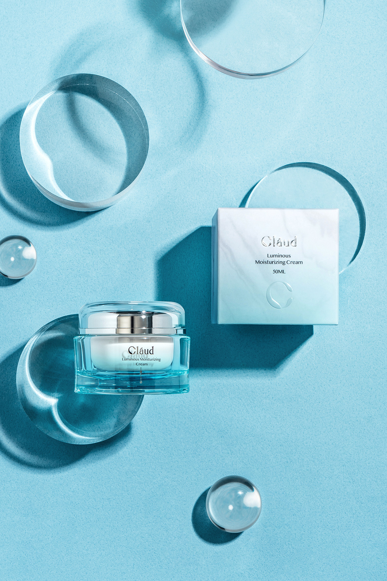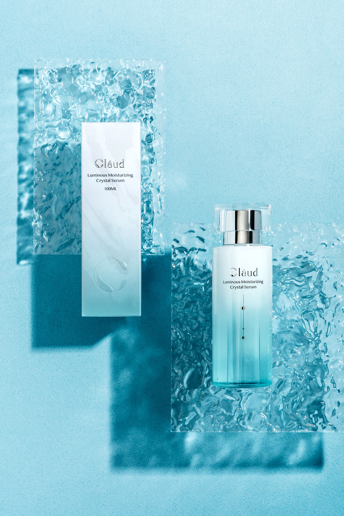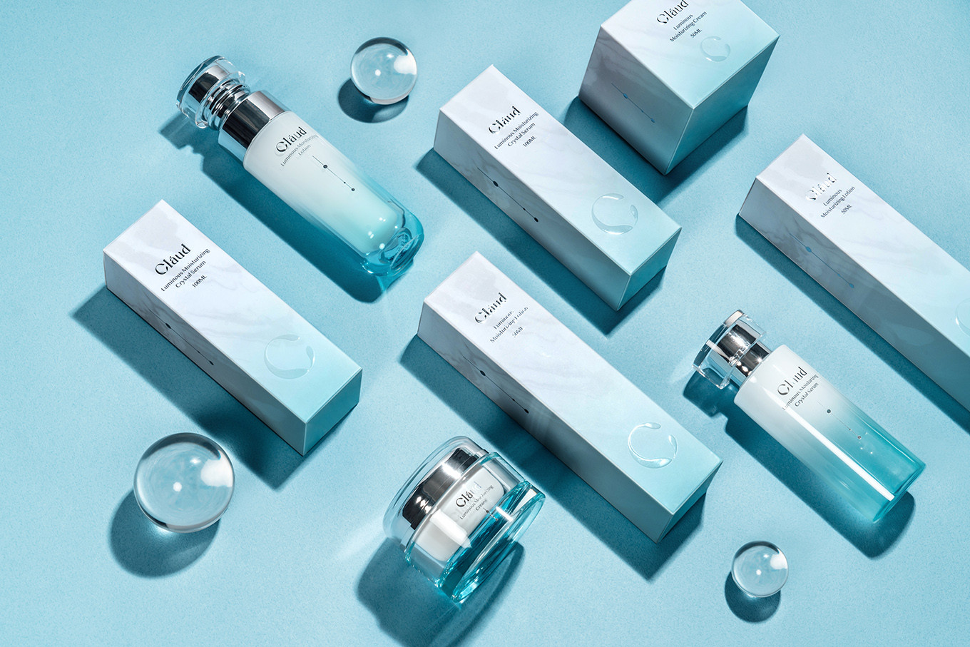 如果KOKORO是低调贵族,Claud就是水中精灵!浅蓝到透明的渐变盒身,搭配若隐若现的水纹纹理,仿佛把一瓶“流动的水光”塞进包装里。产品置身水波纹背景中,瞬间让人脑补“爆水霜”“沁润精华”的清凉触感。长方体盒身圆润收边,既保留简约线条,又弱化了棱角的冷硬感,像极了护肤品该有的温柔脾气。这设计,简直是“视觉降温神器”,夏天看到都想囤一打!