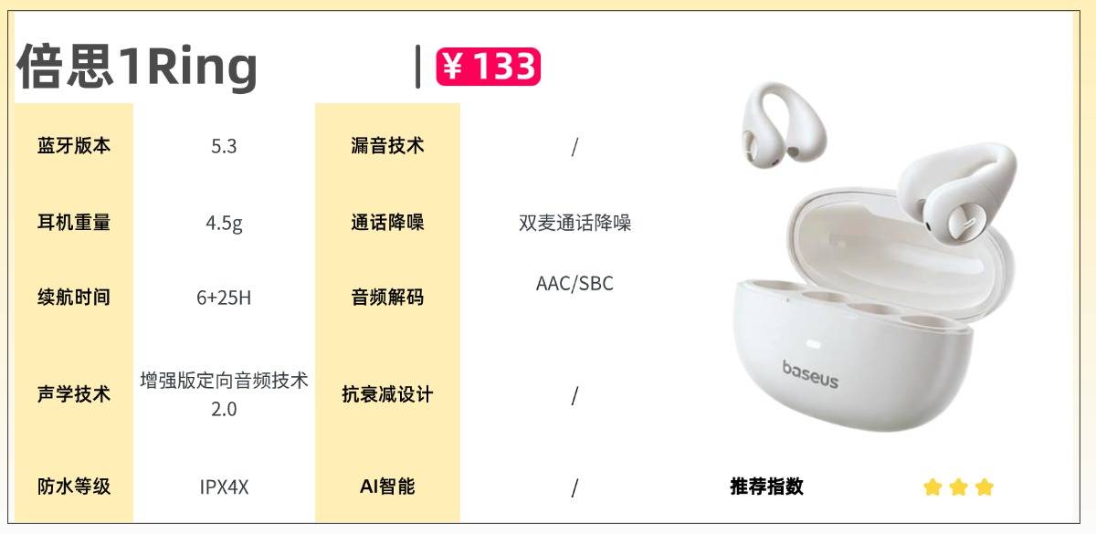 配置方面,OE MIX2搭载DS2.0指向性声学技术与U型声学通道,有效抑制漏音,提升隐私性。采用蓝牙5.4芯片,连接更稳、抗干扰更强。同时具备IPX5防水、24小时续航与AI智能功能,配置全面均衡。在百元价位段,其整体表现显著超越多数同类产品,是值得考虑的开放式耳机优选。