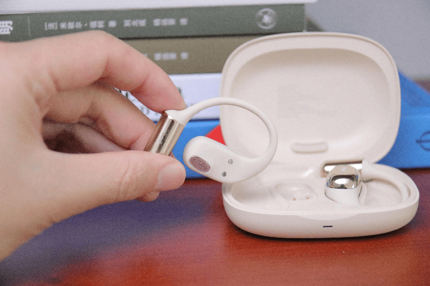 佩戴方面,单耳仅重9.8克的设计带来轻盈手感,舒适度值得认可。耳机采用镍钛记忆金属骨架,可自适应贴合不同耳型,无需反复调整;耳挂外层包覆亲肤硅胶,触感柔顺细腻,长时间佩戴也无明显压迫。