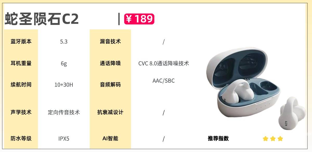 蛇圣C2采用T型360°弧形支撑结构,能够有效包裹贴合耳部,即使在跑步、跳跃或快速转头等大幅动作下,也能稳固佩戴,不易滑落。耳机与耳朵接触部分使用柔软顺滑的硅胶材质,触感亲肤,但由于耳夹尺寸偏小,耳型较厚的用户在长时间佩戴后可能感到轻微压迫。
